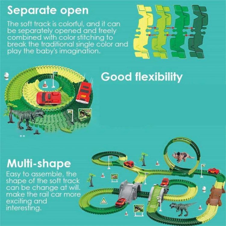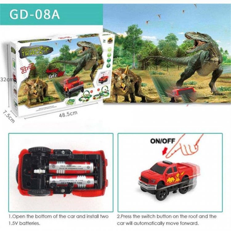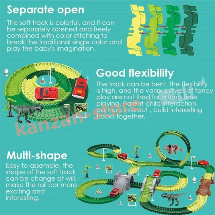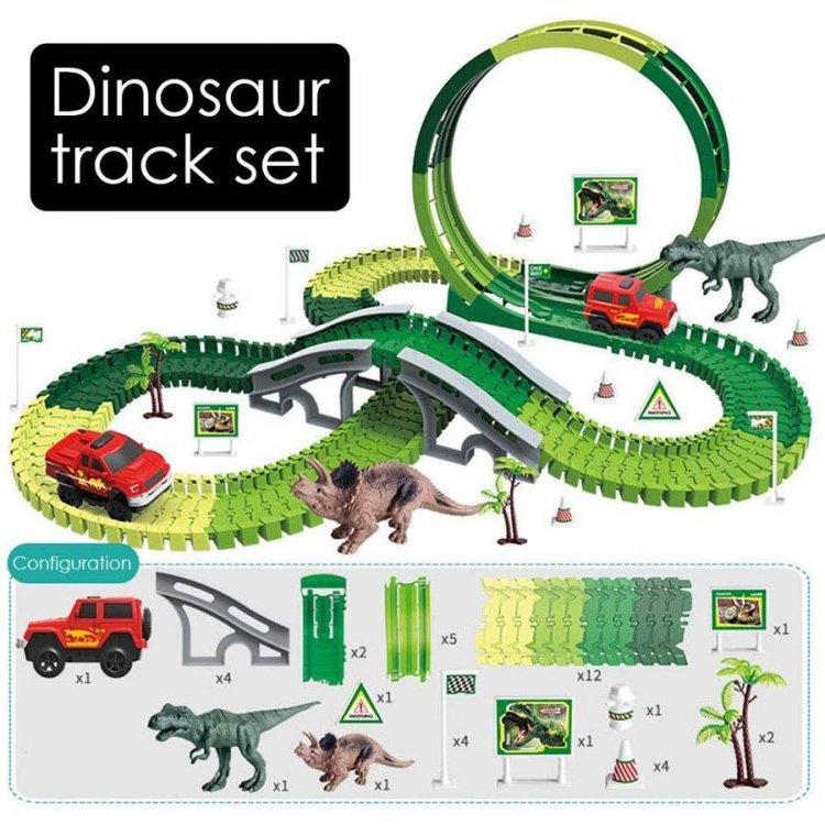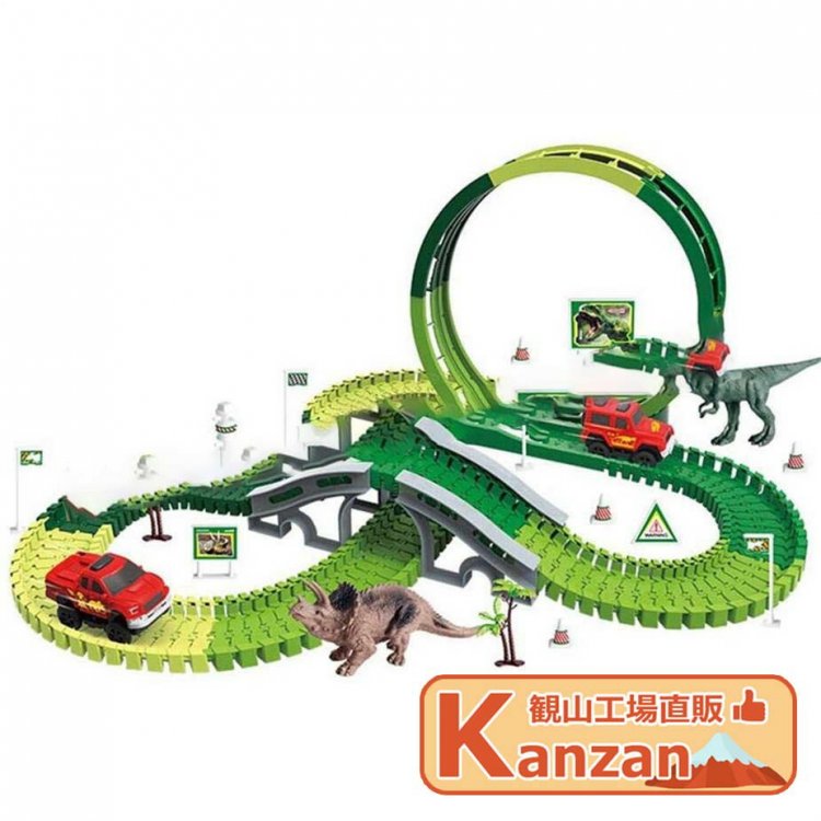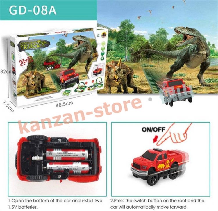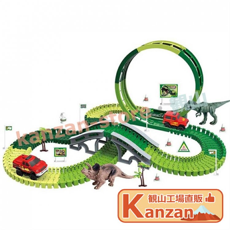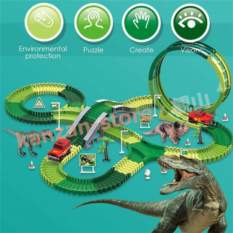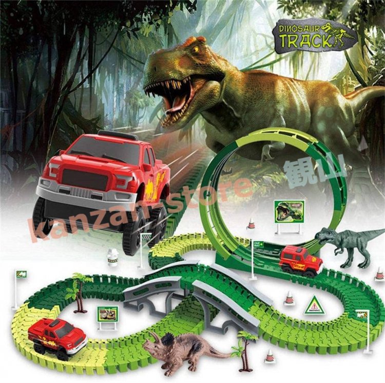リスト:恐竜のおもちゃのレーストラックと様々なアクセサリー、トラックの長さは約305cmです。 12個のフレキシブルトラック、2個の恐竜、7個のスロット、2個のヤシの木、12個の道路標識、4個の自動ターニングステーション、バッテリー駆動のレーシングカーなどがあります