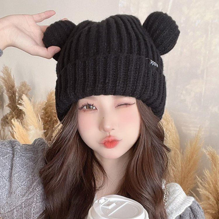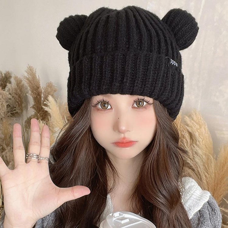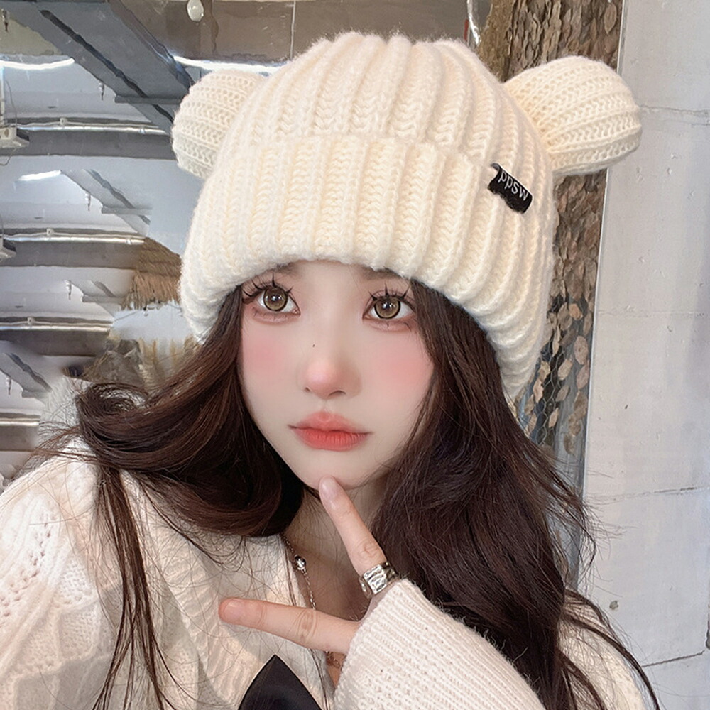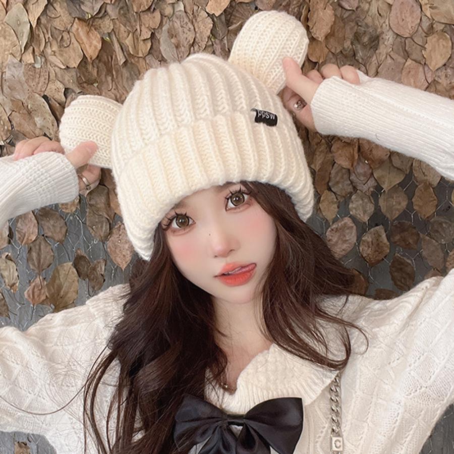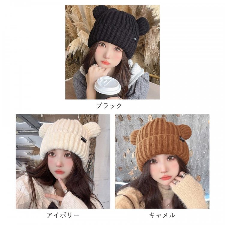 秋冬 耳付き 厚手 リブ編み帽子 小顔 可愛い 寒さ対策 おしゃれ コスプレ 仮装帽子 3色 黒