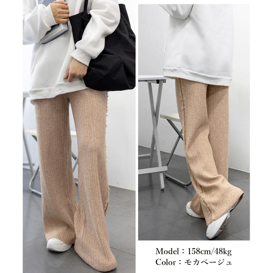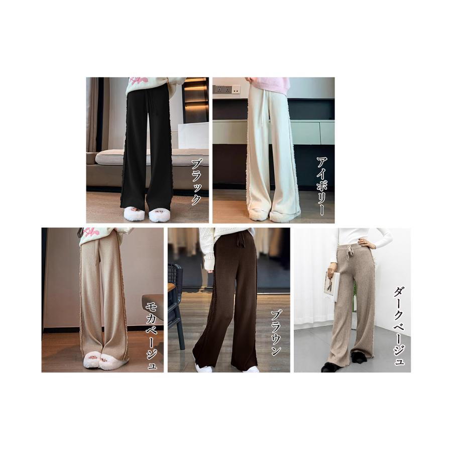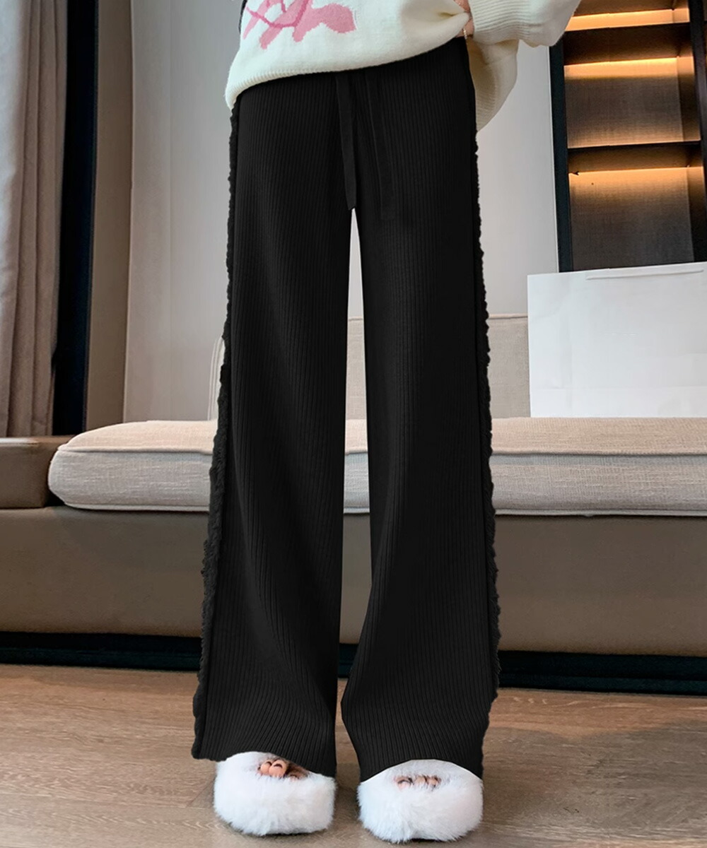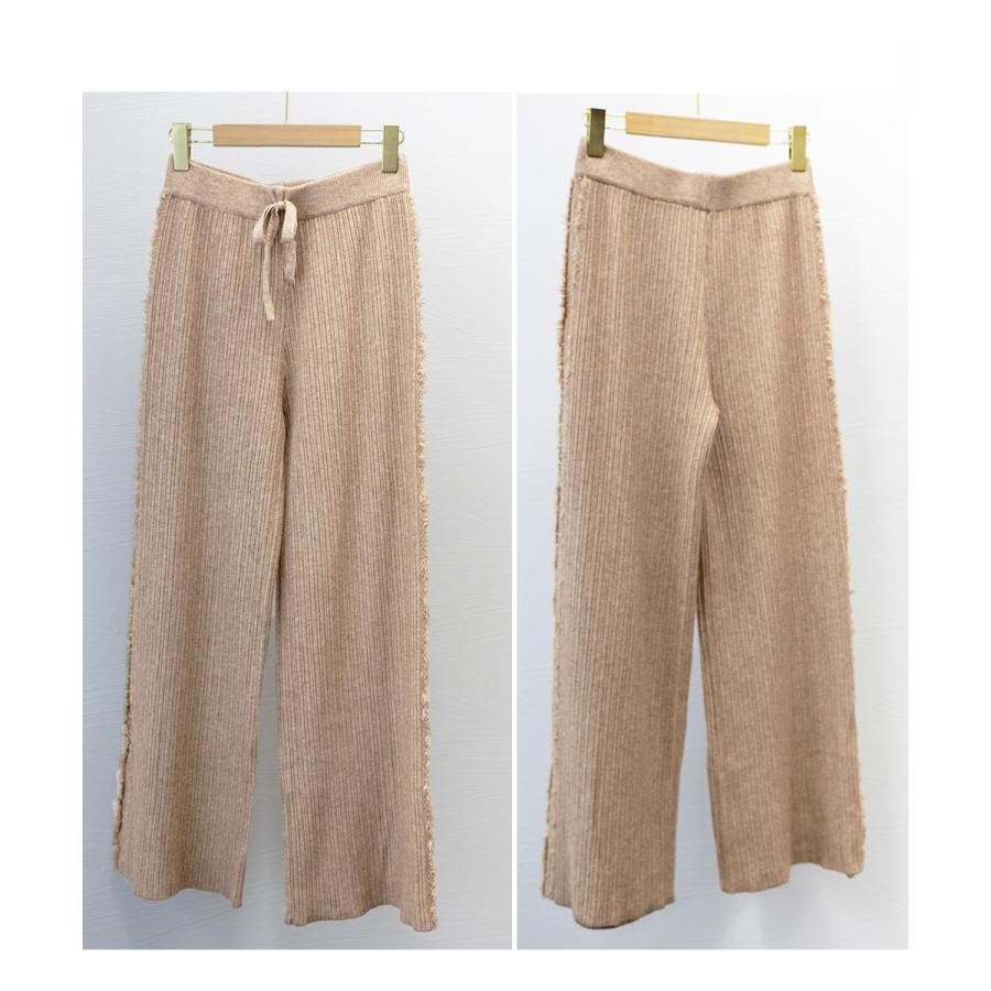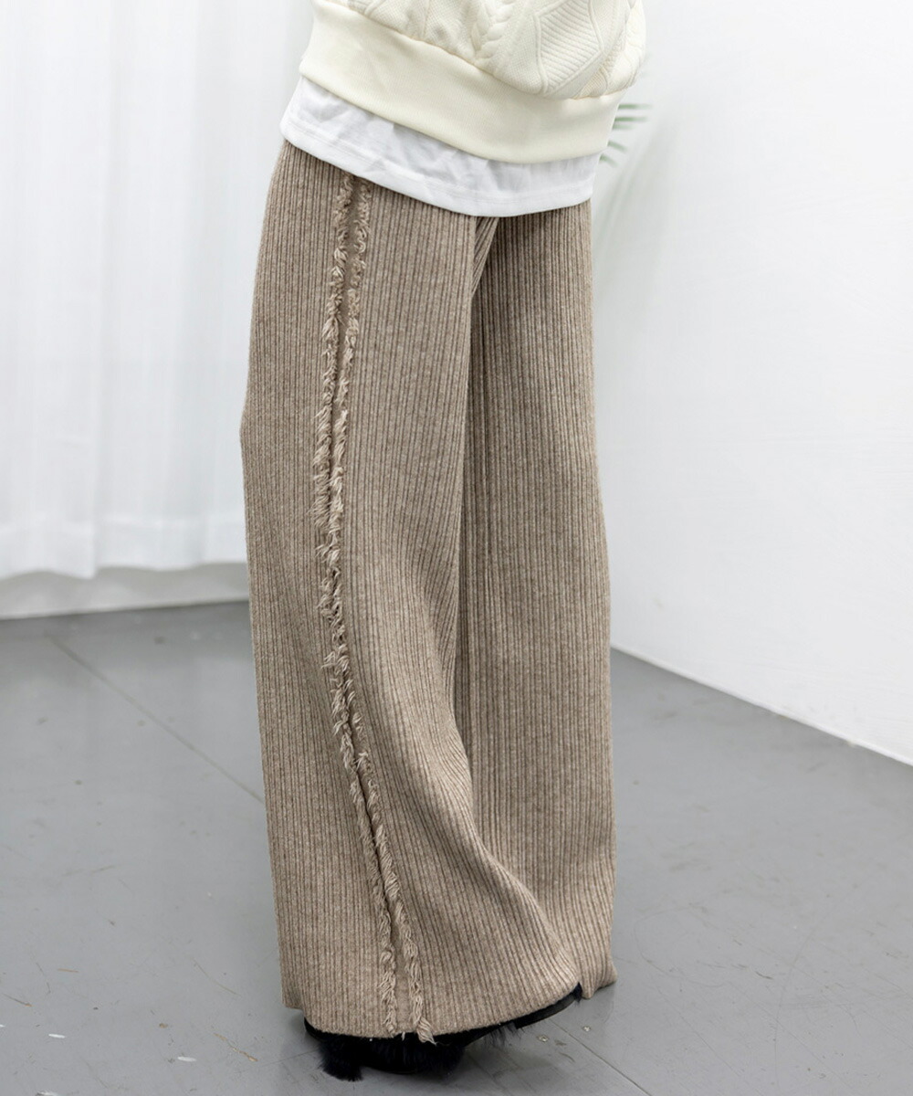 サイドにあしらったフリンジのラインが、プレーンなリブニットにひねりをプラスしているワイドパンツ