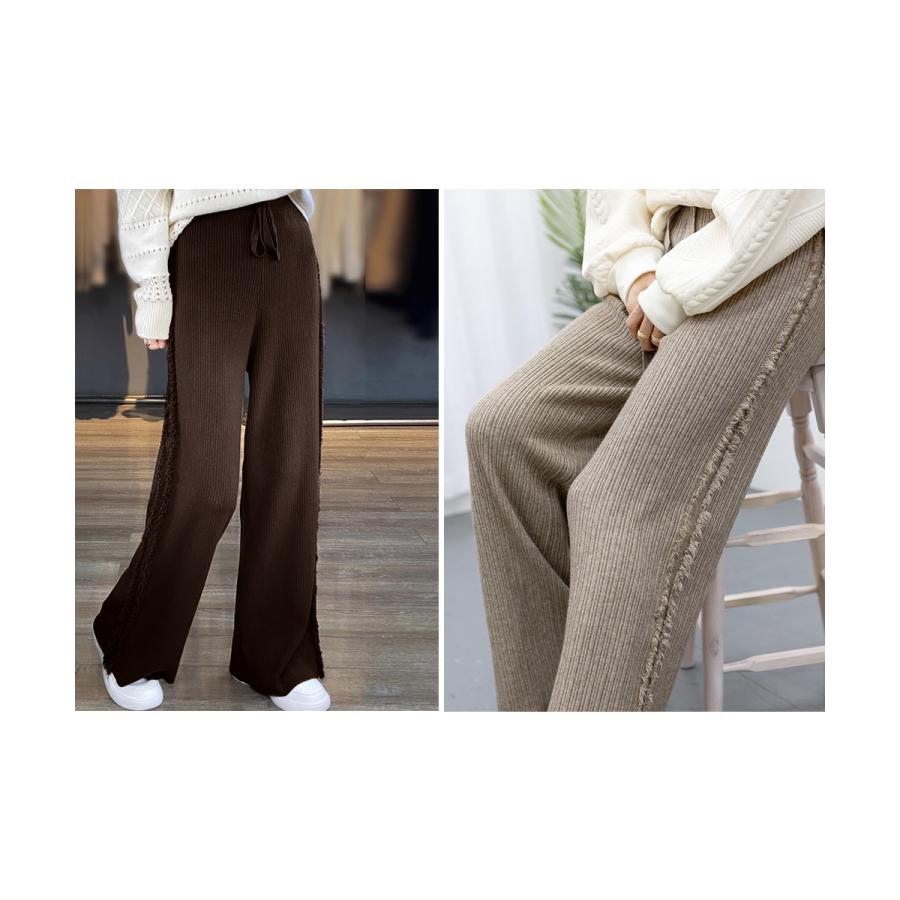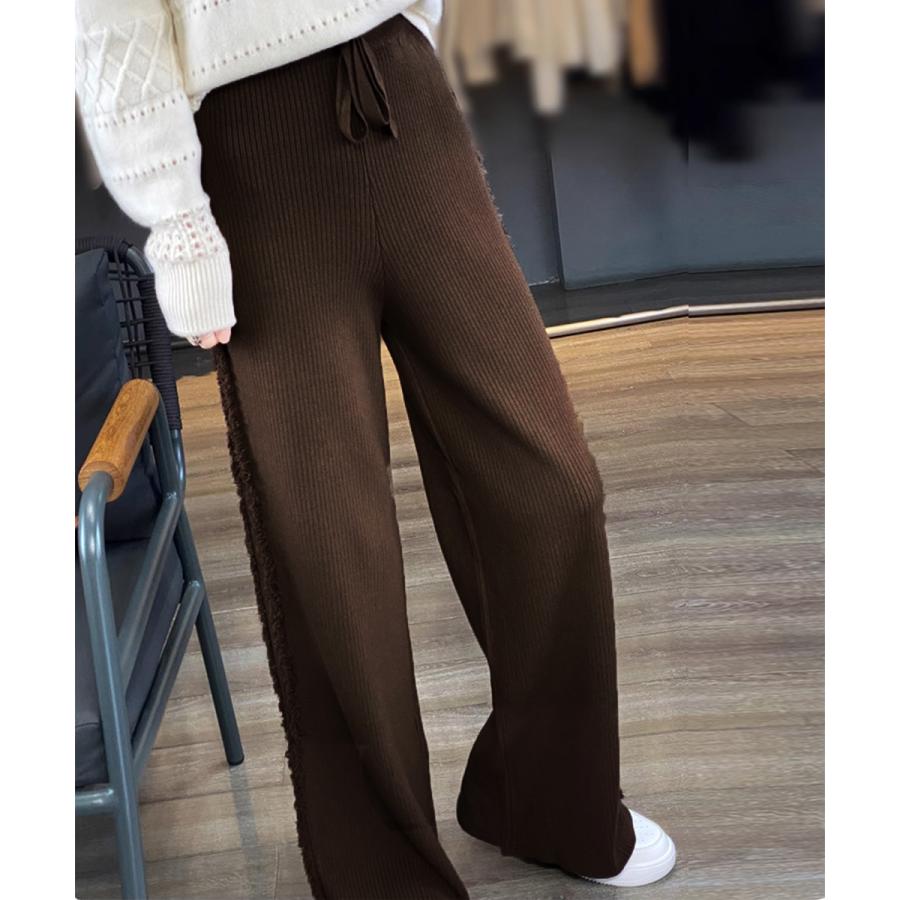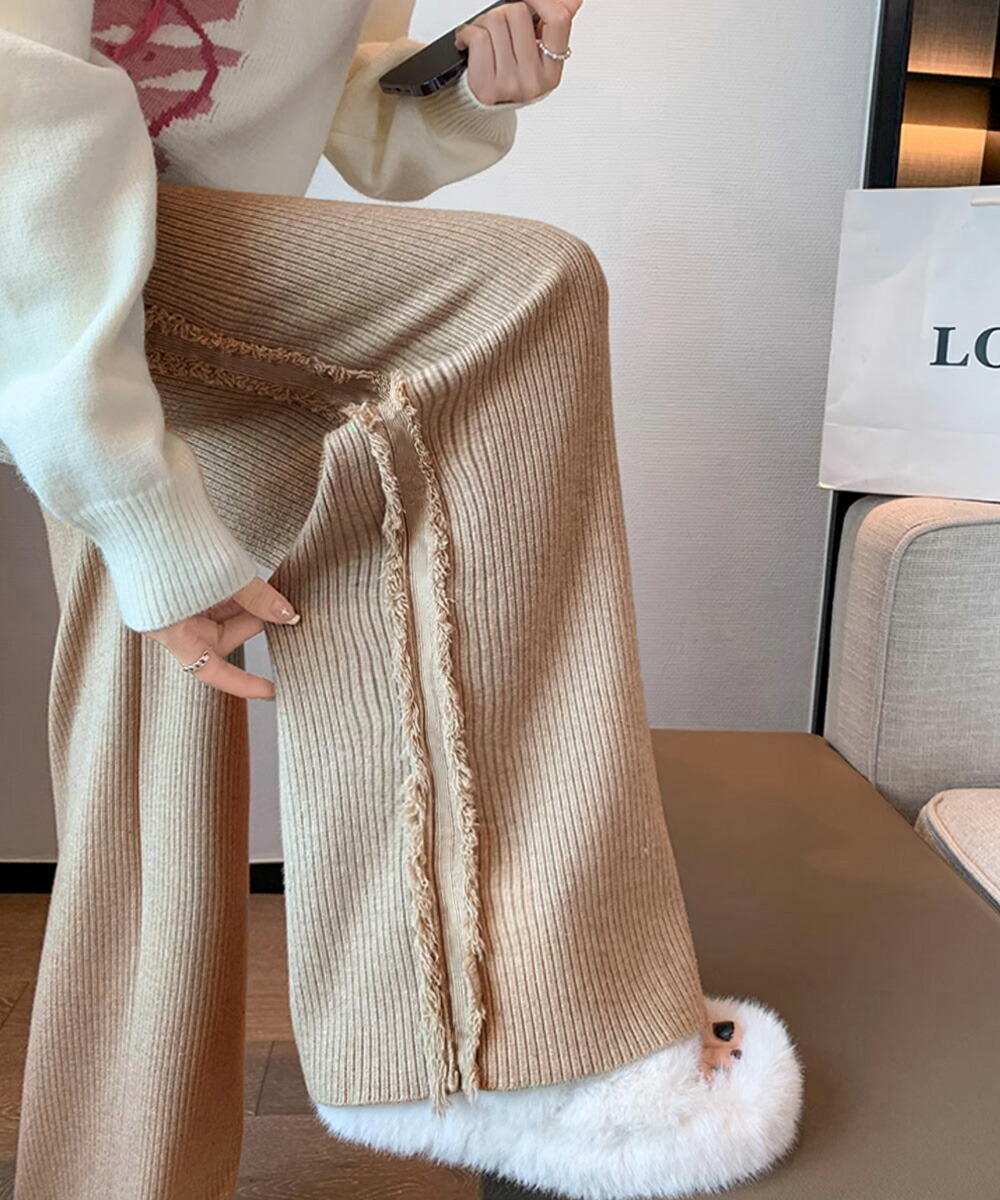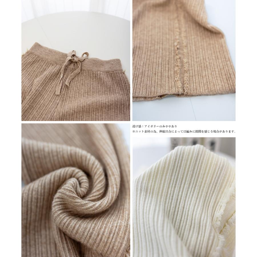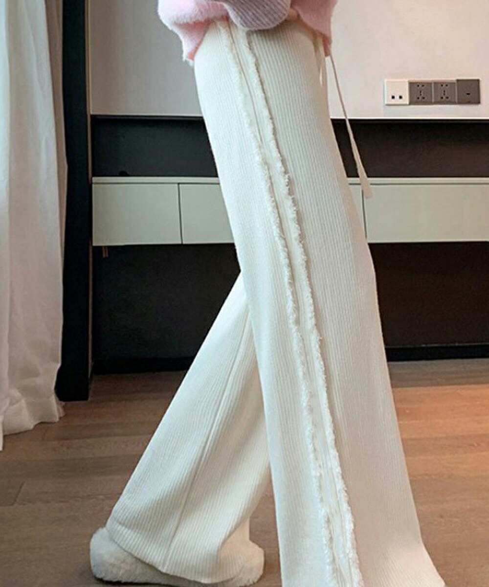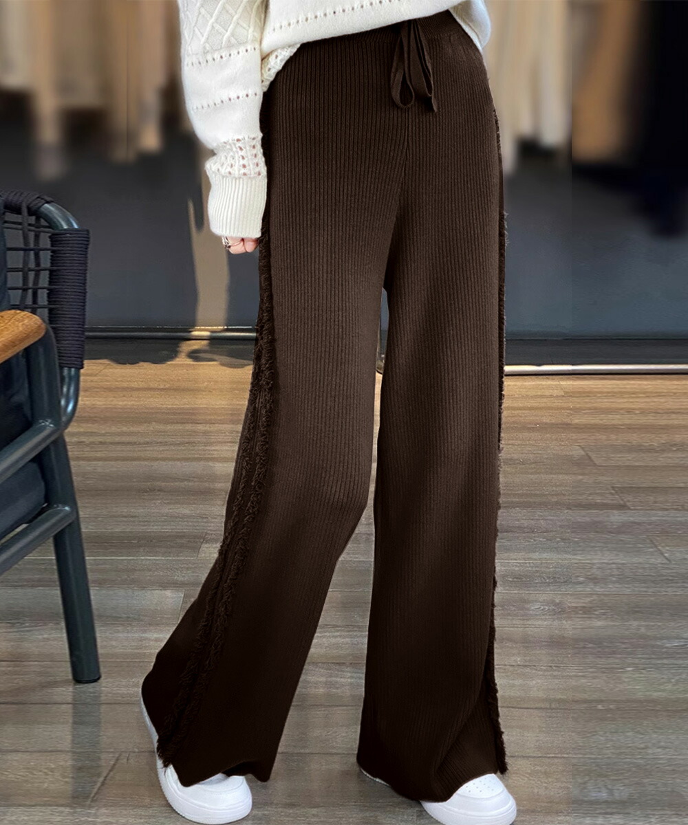 サイドにあしらったフリンジのラインが、プレーンなリブニットにひねりをプラスしているワイドパンツ