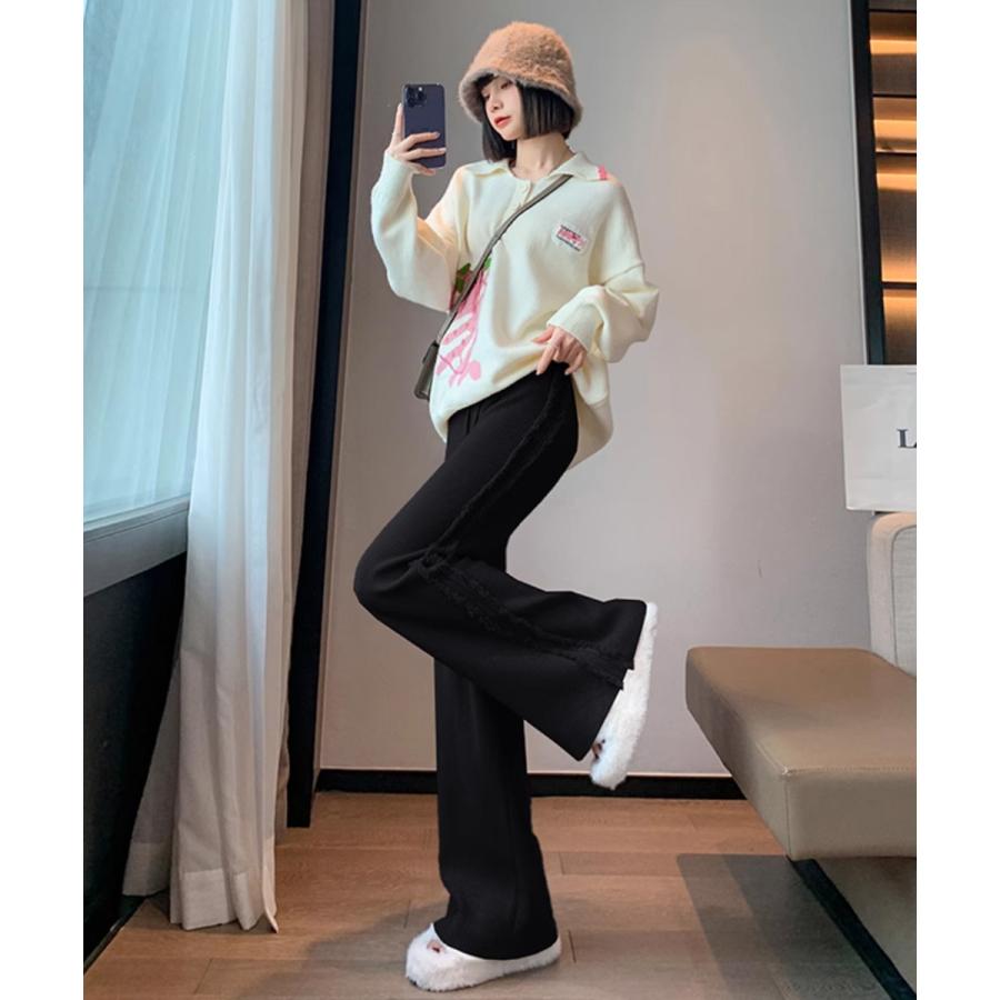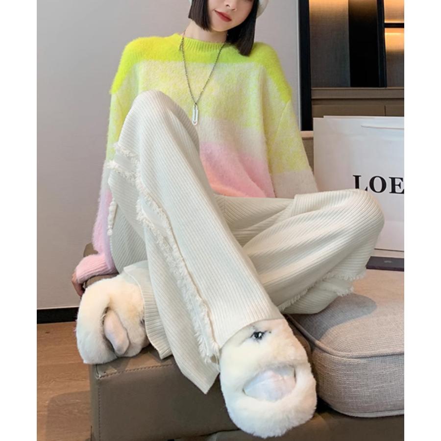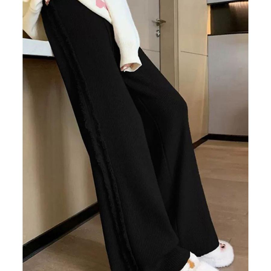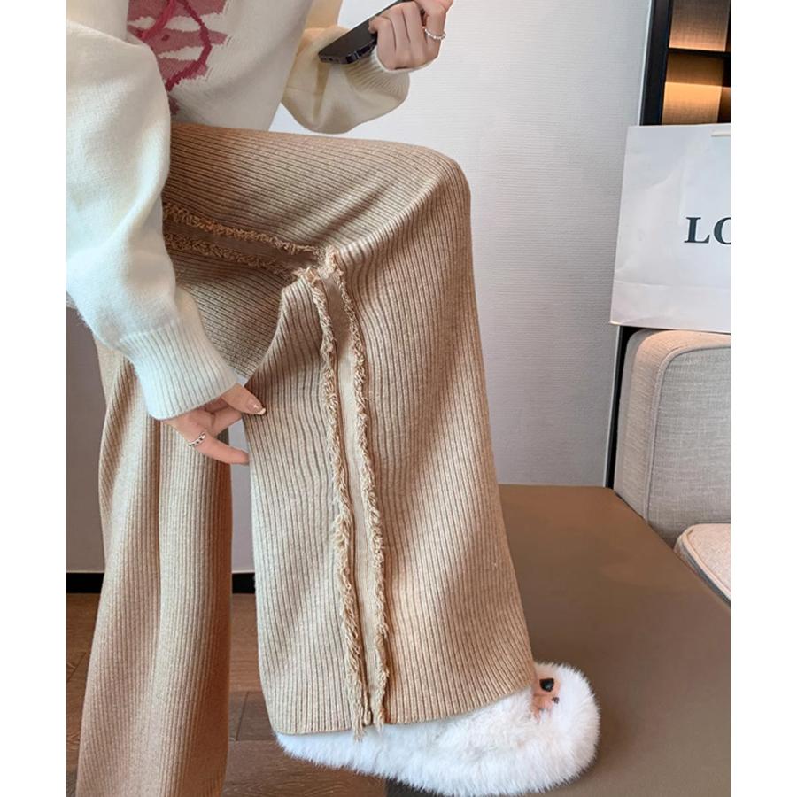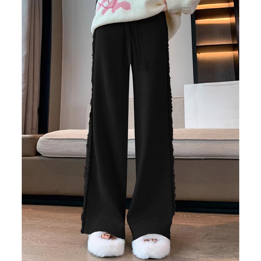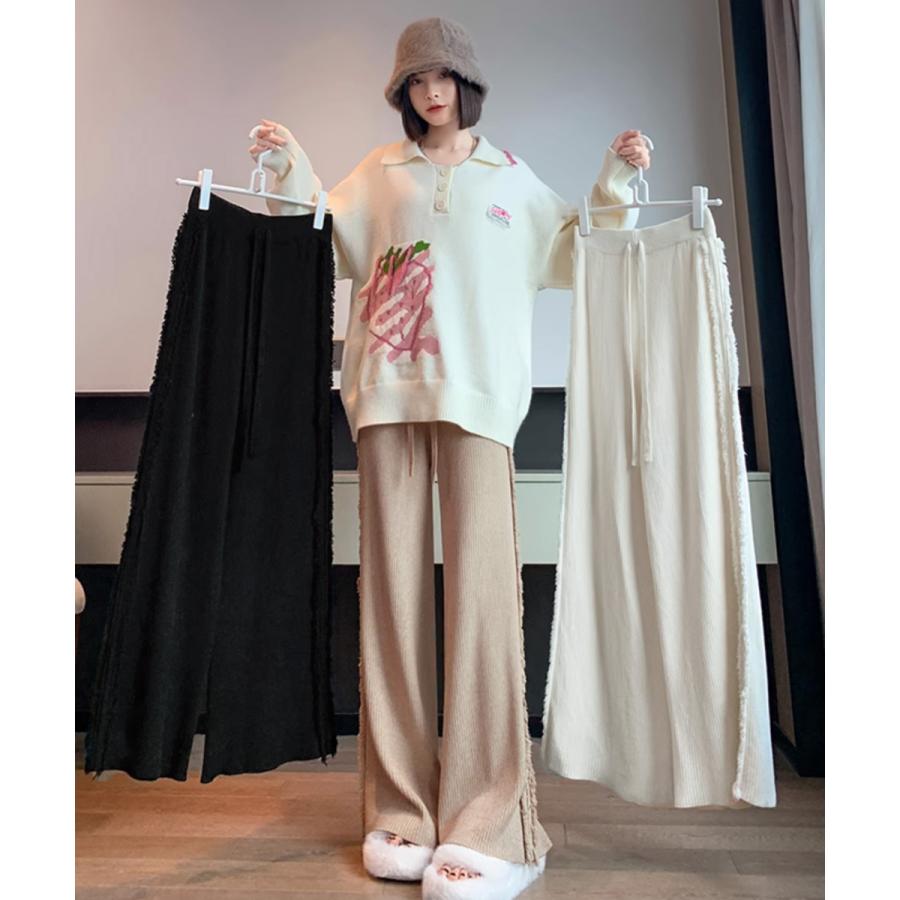 サイドにあしらったフリンジのラインが、プレーンなリブニットにひねりをプラスしているワイドパンツ