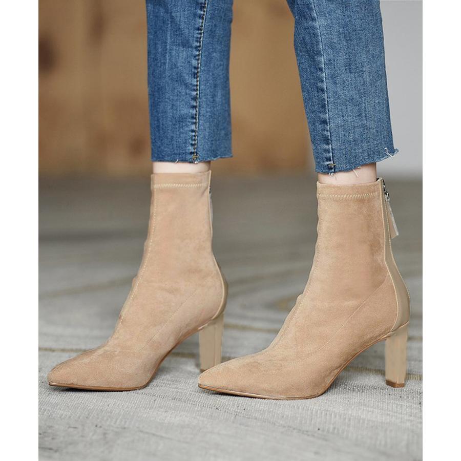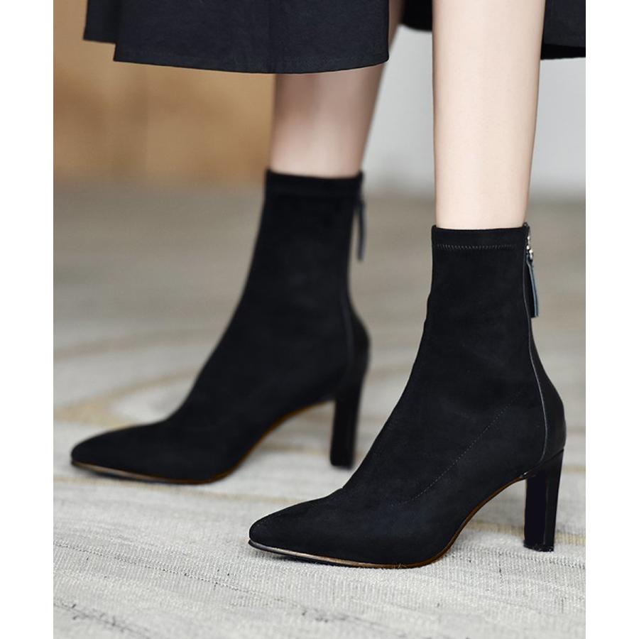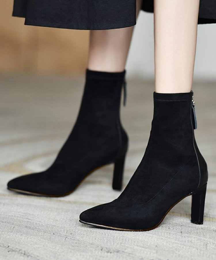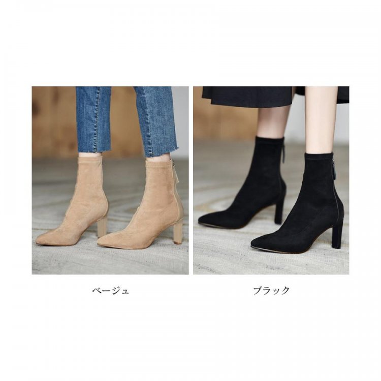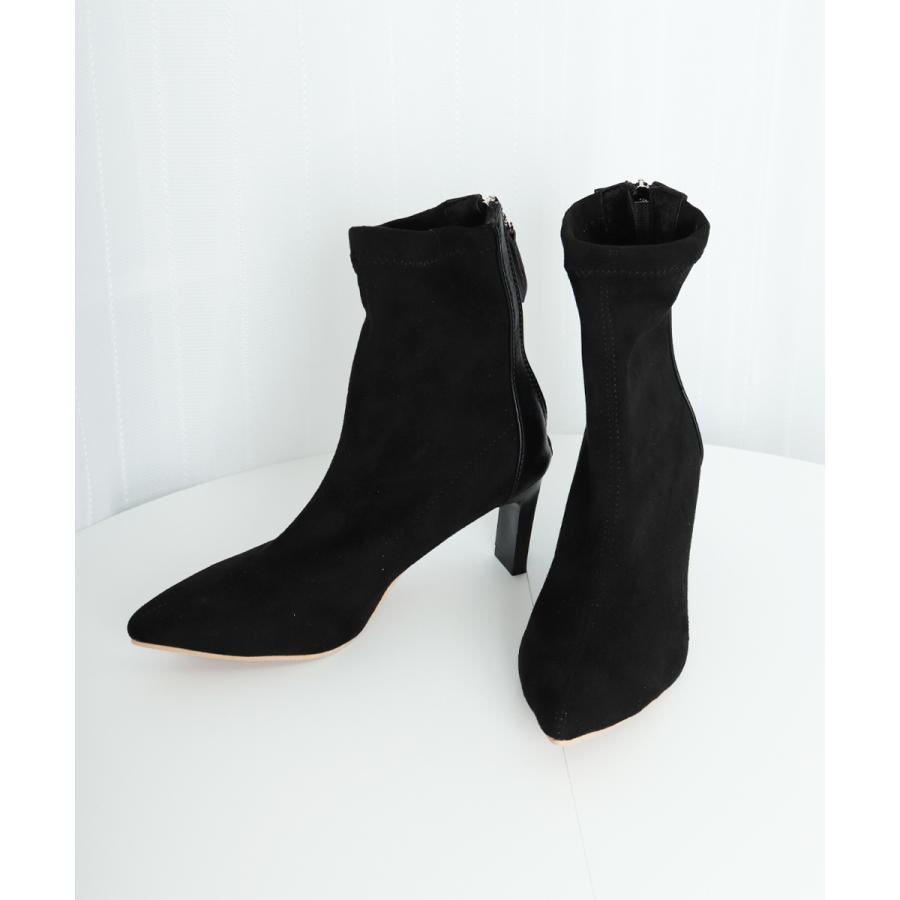 ポインテッドトゥ 美脚ブーツ ブーティ チャンキーヒール シンプル 無地 秋冬 履きやすい ショート丈 軽量靴 おしゃれ