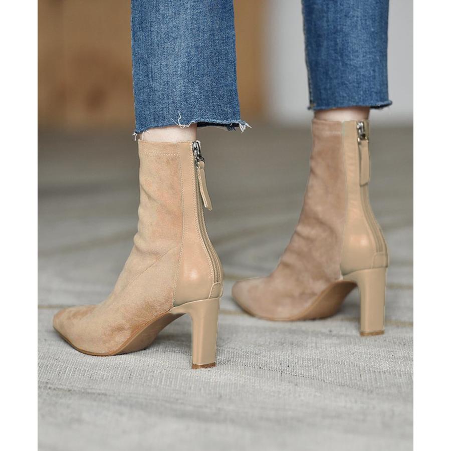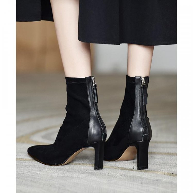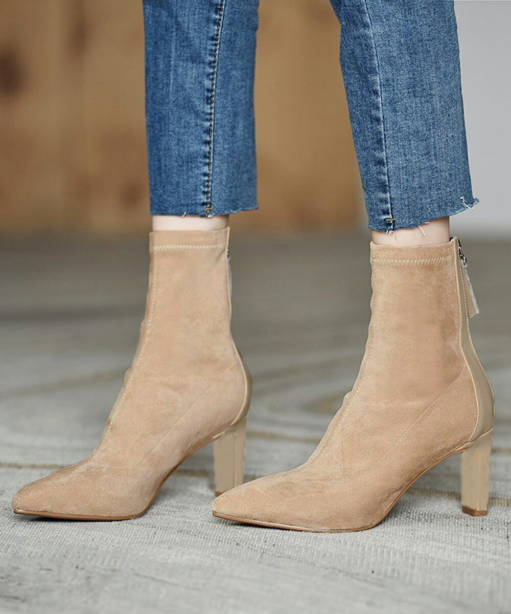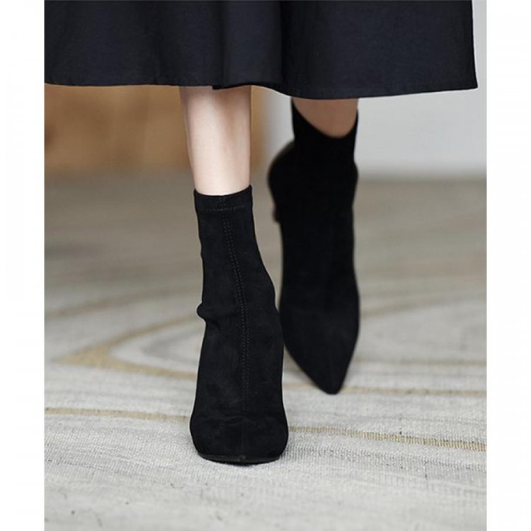ポインテッドトゥ 美脚ブーツ ブーティ チャンキーヒール シンプル 無地 秋冬 履きやすい ショート丈 軽量靴 おしゃれ