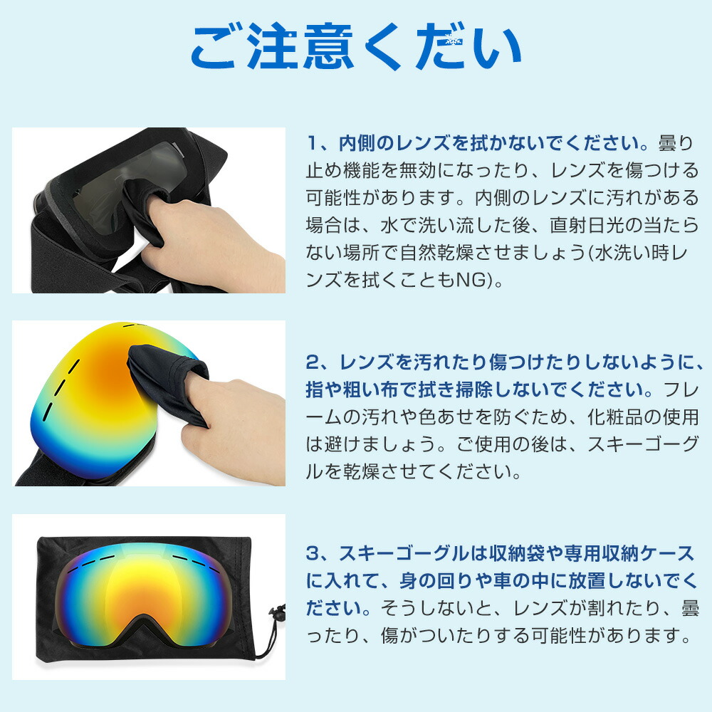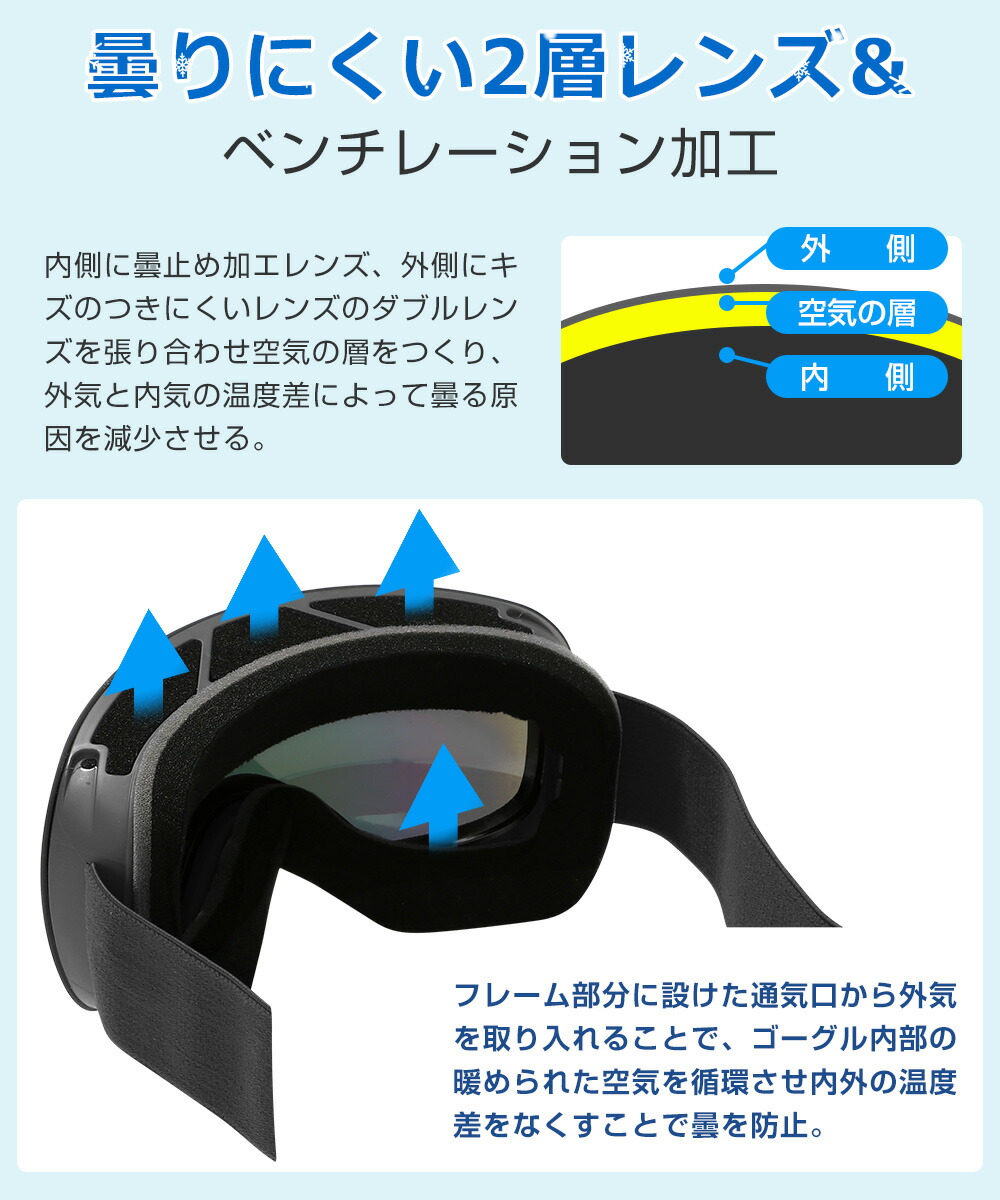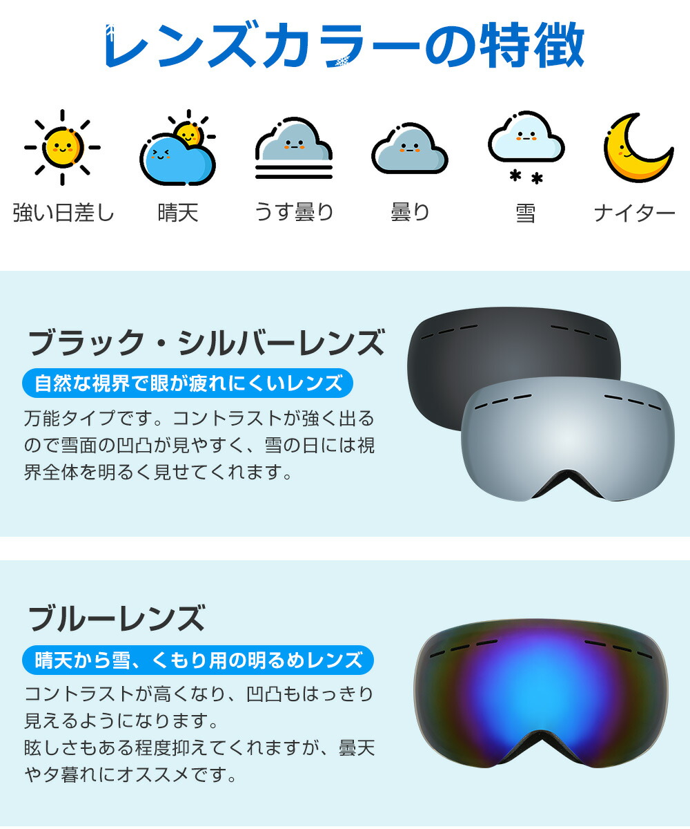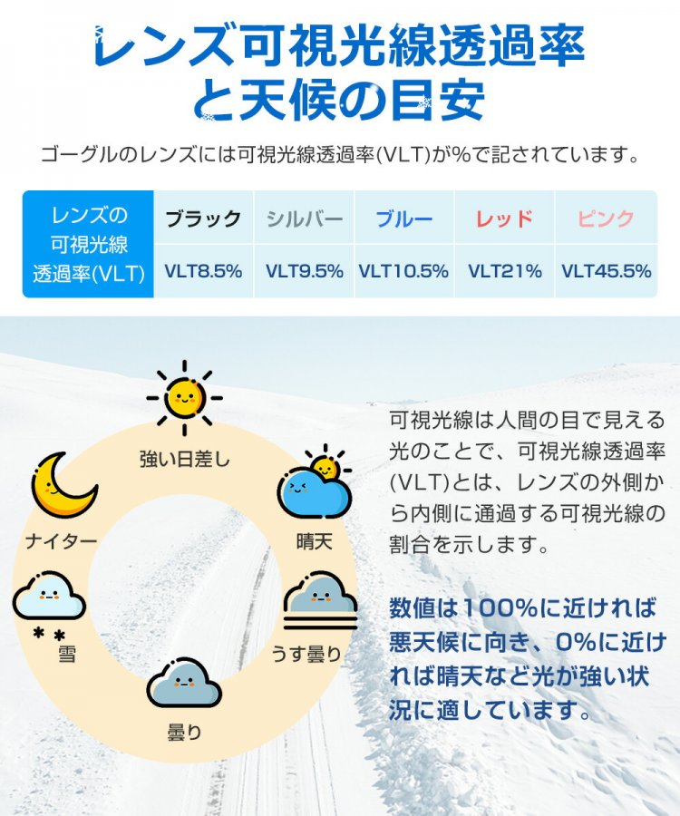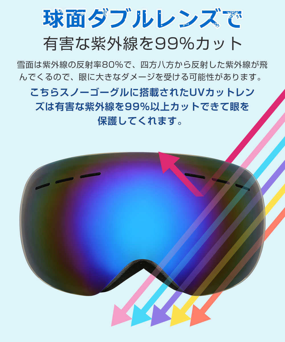ゴーグルを着ける一番の目的は「紫外線をから目を守る」ため。二つ目は雪や風から「視界を確保する」ため。三つ目は転んだ時に「ケガから目を守る」ため。