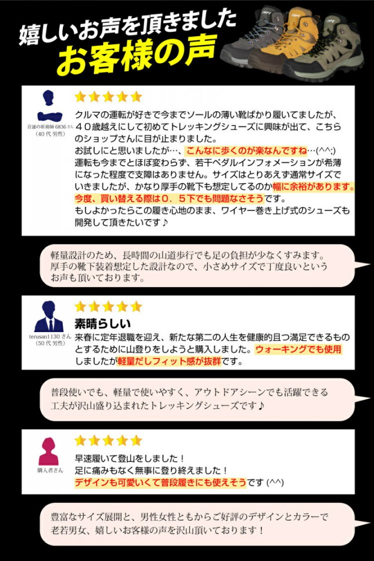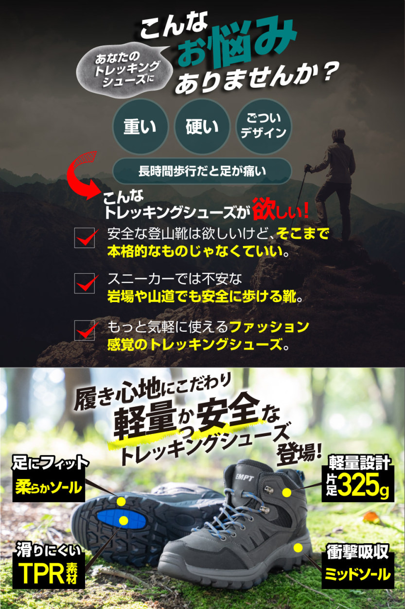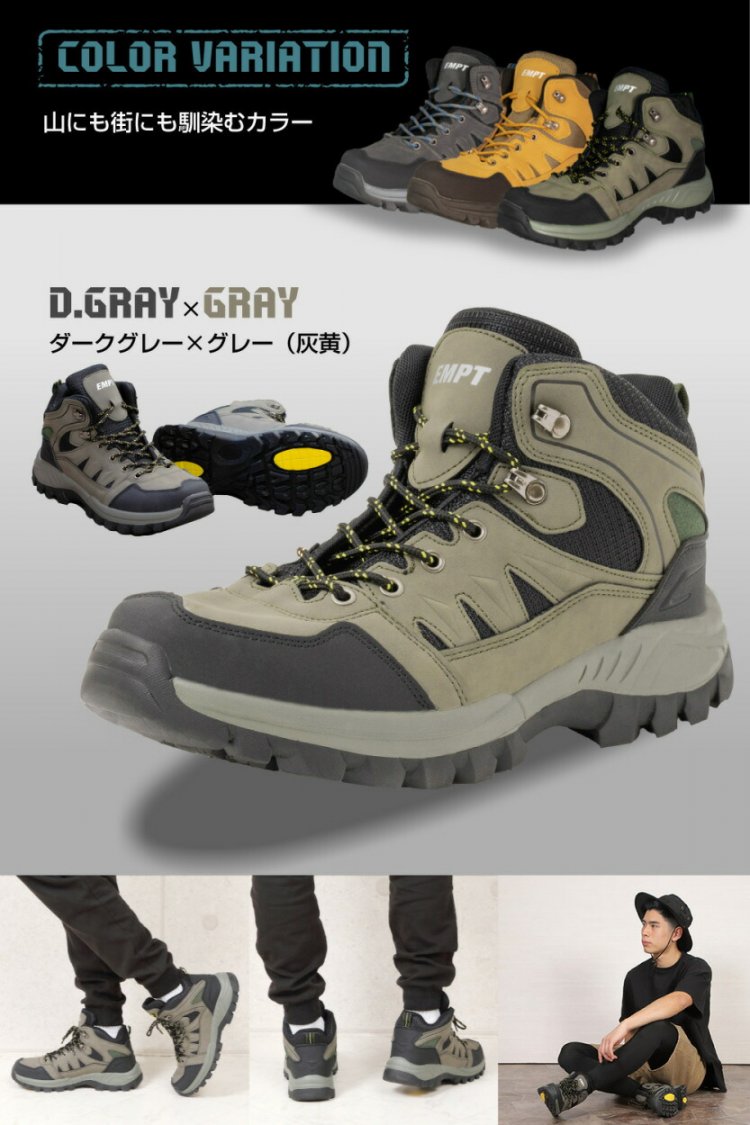 ゴツすぎず 色味も登山靴にありがちな派手なデザインではなく極力色数を抑えました。 ハイキング や キャンプ 普段の ウォーキング にも気軽にお使いいただけます。