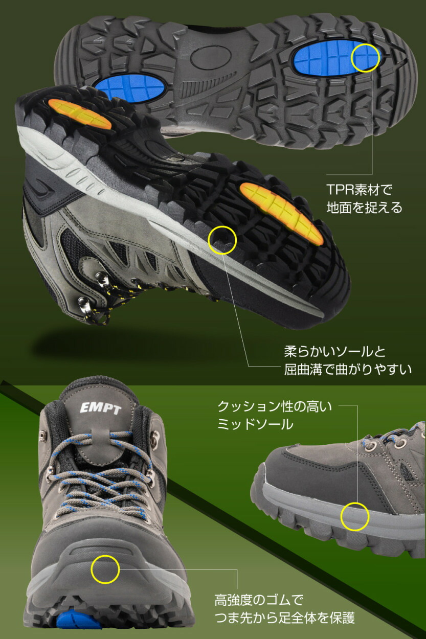 ソールは特殊深溝構造と滑り止めゴムを配置しているため、しっかりと地面をグリップし、ミッドソールはクッション性の高い素材で地面からの衝撃を緩和し足への負担をより軽くなるように設計しています。