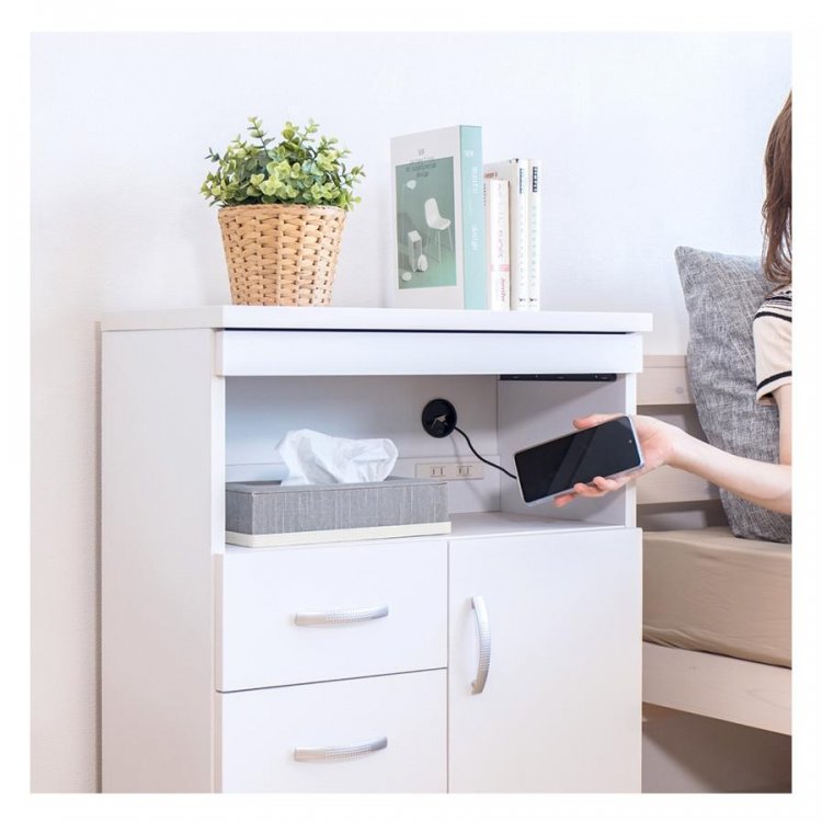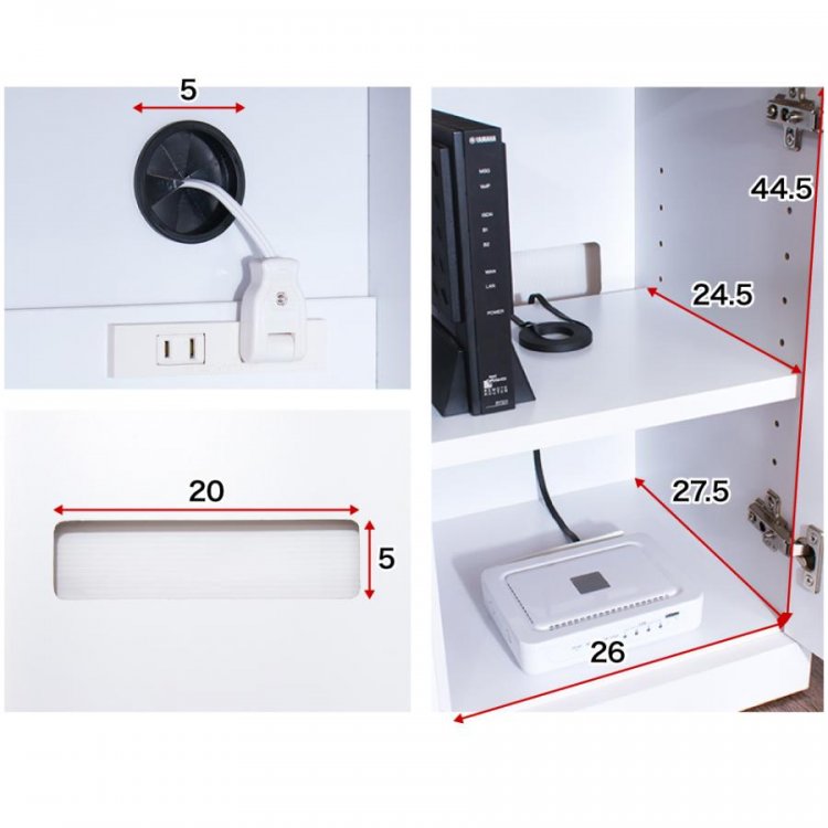 機能的な電話台です。電話やルーターその他スマホの充電器などをすっきり収納できます。1500W2口コンセント付き、背面に2ヵ所コード穴があります。扉内棚板の奥は、配線が通るように約3cmの隙間を設けています