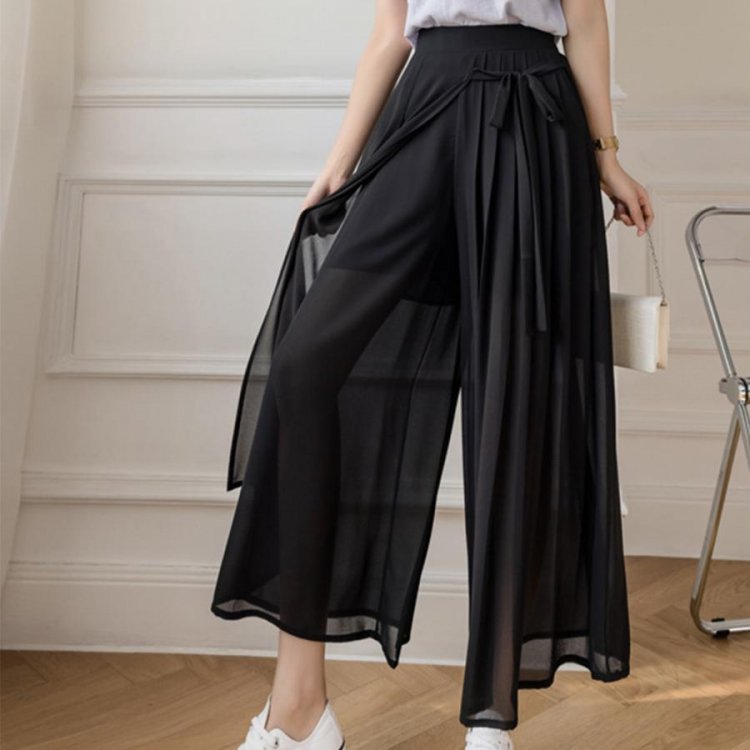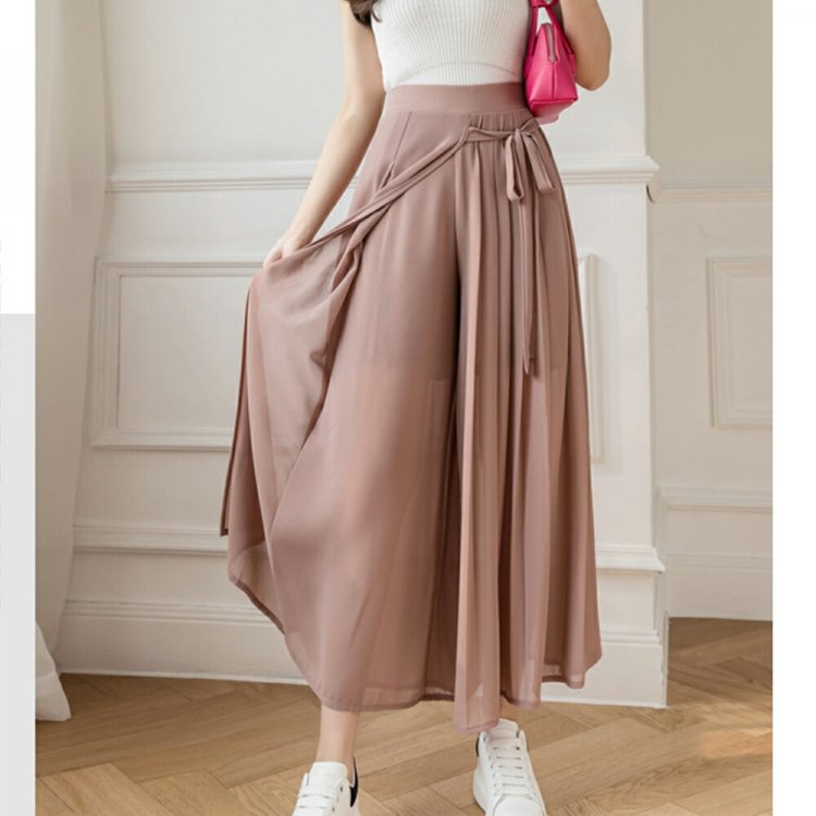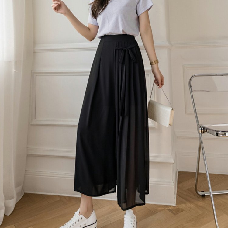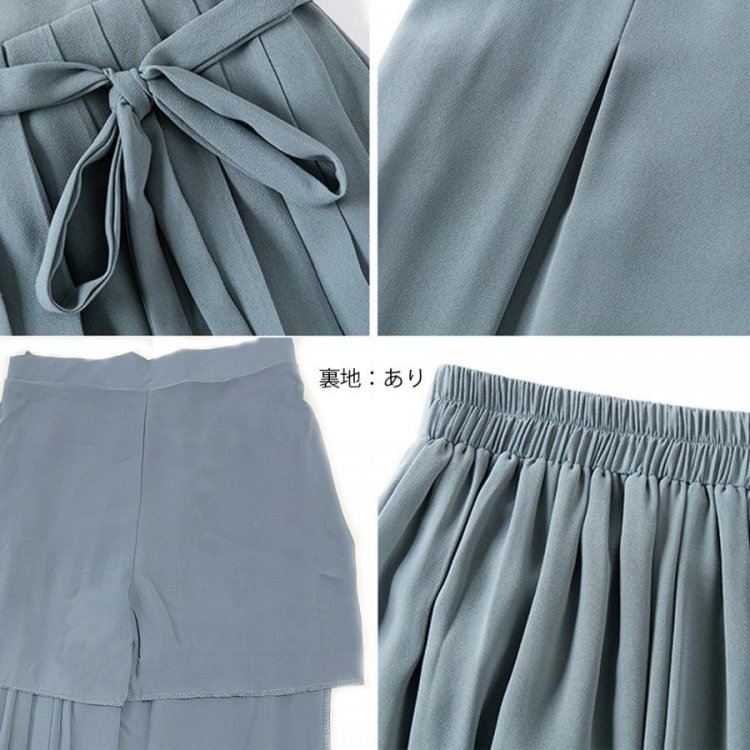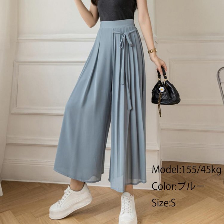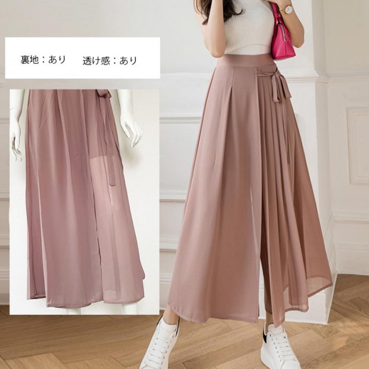 スカートのようなシルエットが女性らしく着こなせるシフォンワイドパンツ