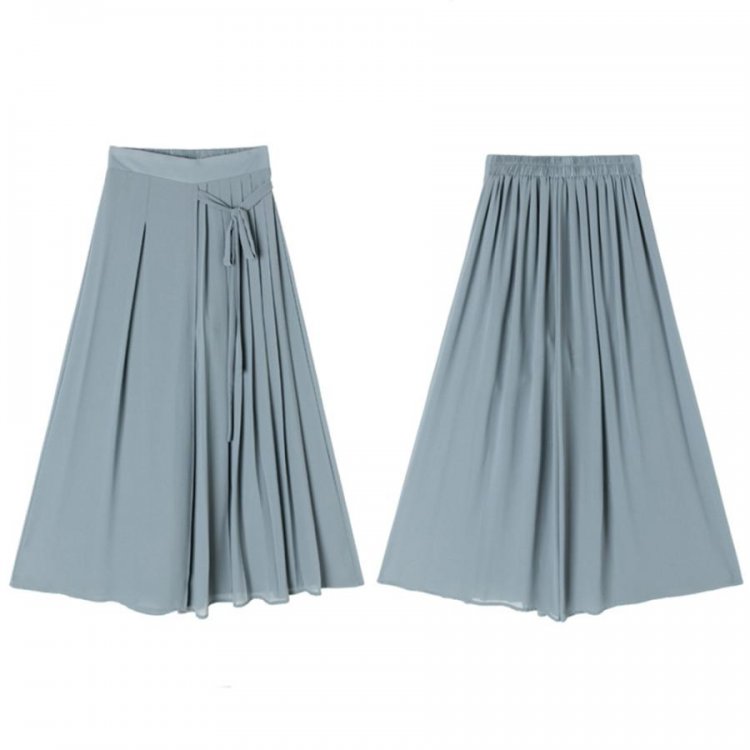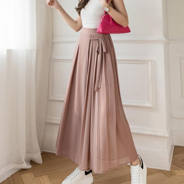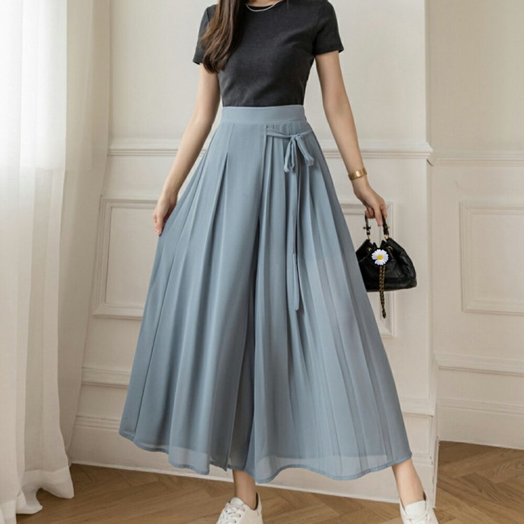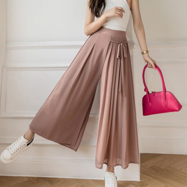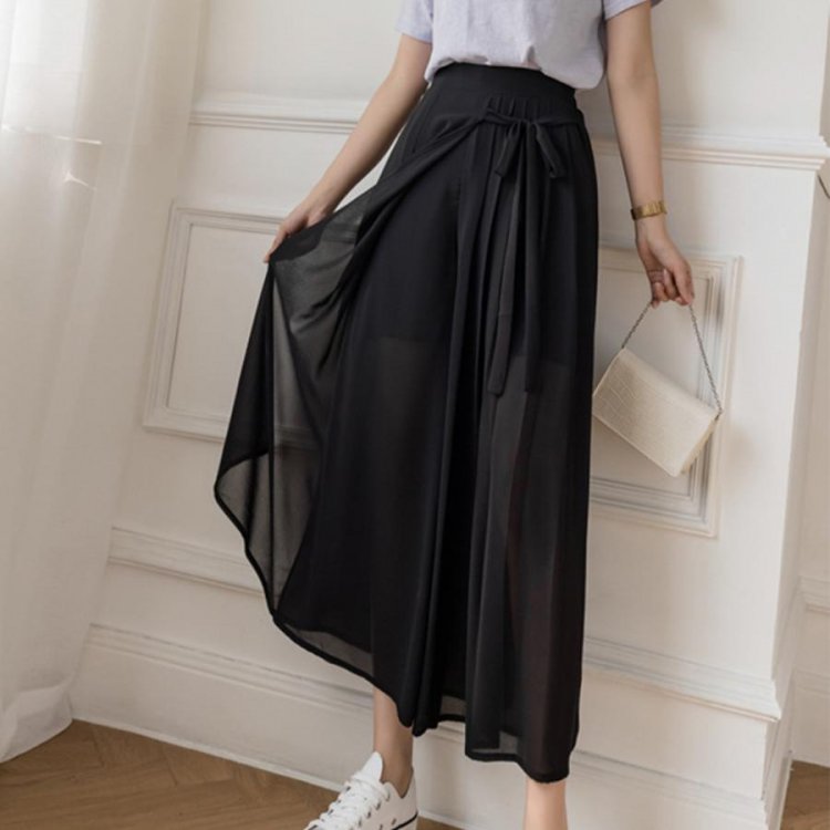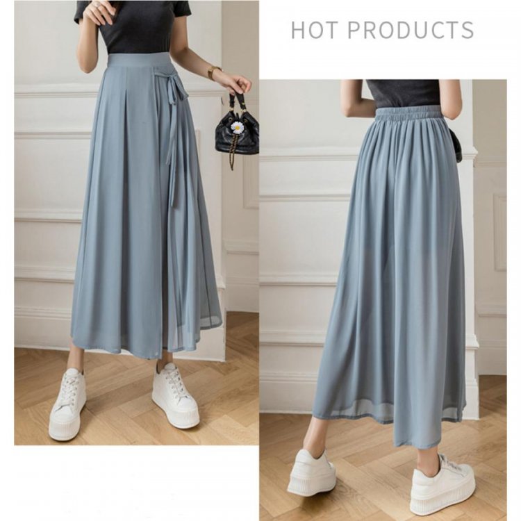 スカートのようなシルエットが女性らしく着こなせるシフォンワイドパンツ