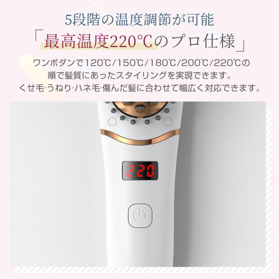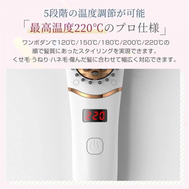 【5段温度設定&デジタル温度表示】一目でわかる数字で温度を表示しているディスプレイ、ワンボダンで120℃/150℃/180℃/200℃/220℃の順で髪質にあったスタイリングを実現できます。