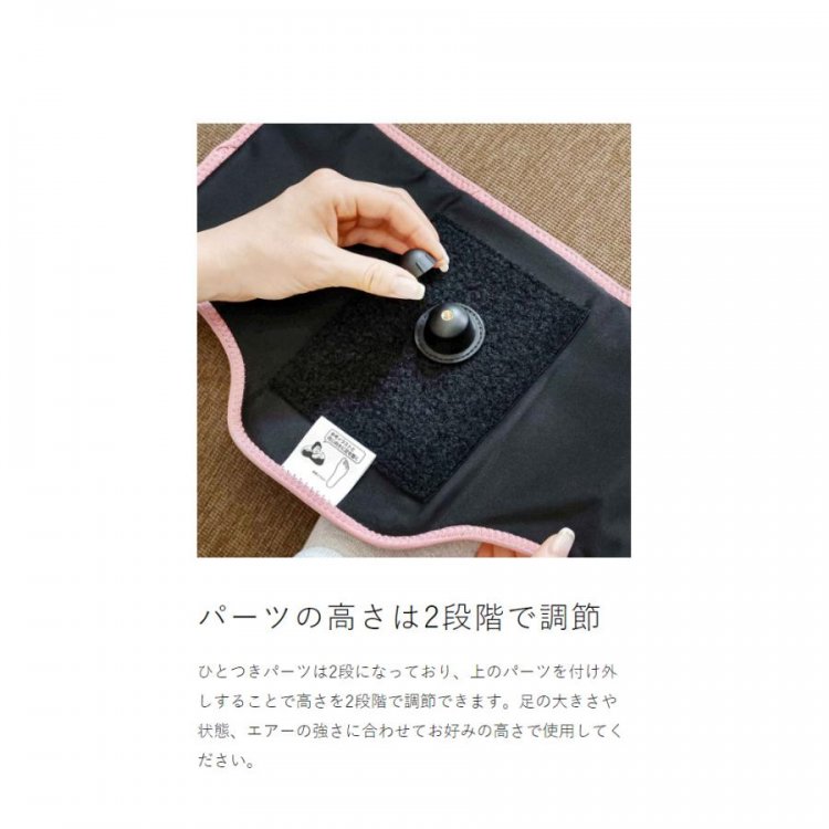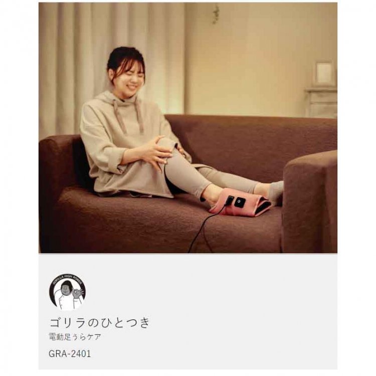 『 ゴリラのひとつき 』は、コンパクトながら絶妙な強さで、片方ずつ足裏を包んでリフレッシュさせてくれる電動フットケアアイテム。内蔵された強力ポンプ&エアバッグと、高さを2段階に調節できるひとつきパーツによって、まるでゴリラの指突きのようなハイパワーを実現。付属の電源ケーブルをつなぎ、ボタンを押すだけのシンプル操作で、パワー調節は弱中強の3段階。大きな面ファスナーで装着も簡単。電源を入れて10分後に自動停止する安全設計も◎です。