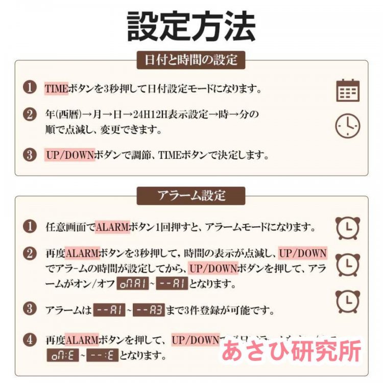 アラーム3組は鳴る間隔や回数はお好みで設定可能なので、二度寝防止に最適!
