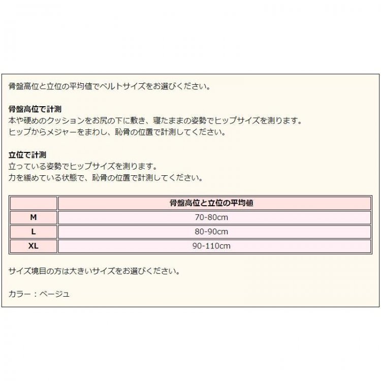 骨盤高位と立位の平均値でベルトサイズをお選びください。