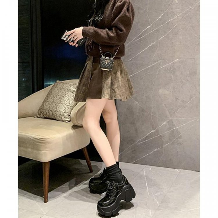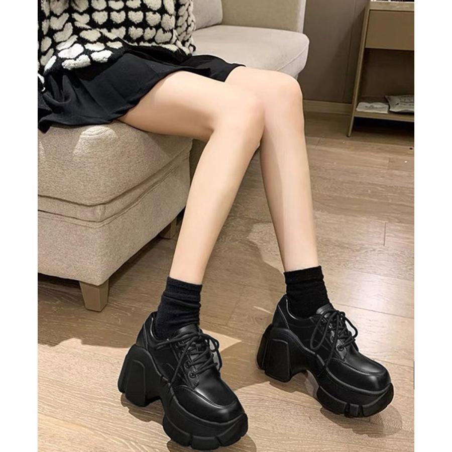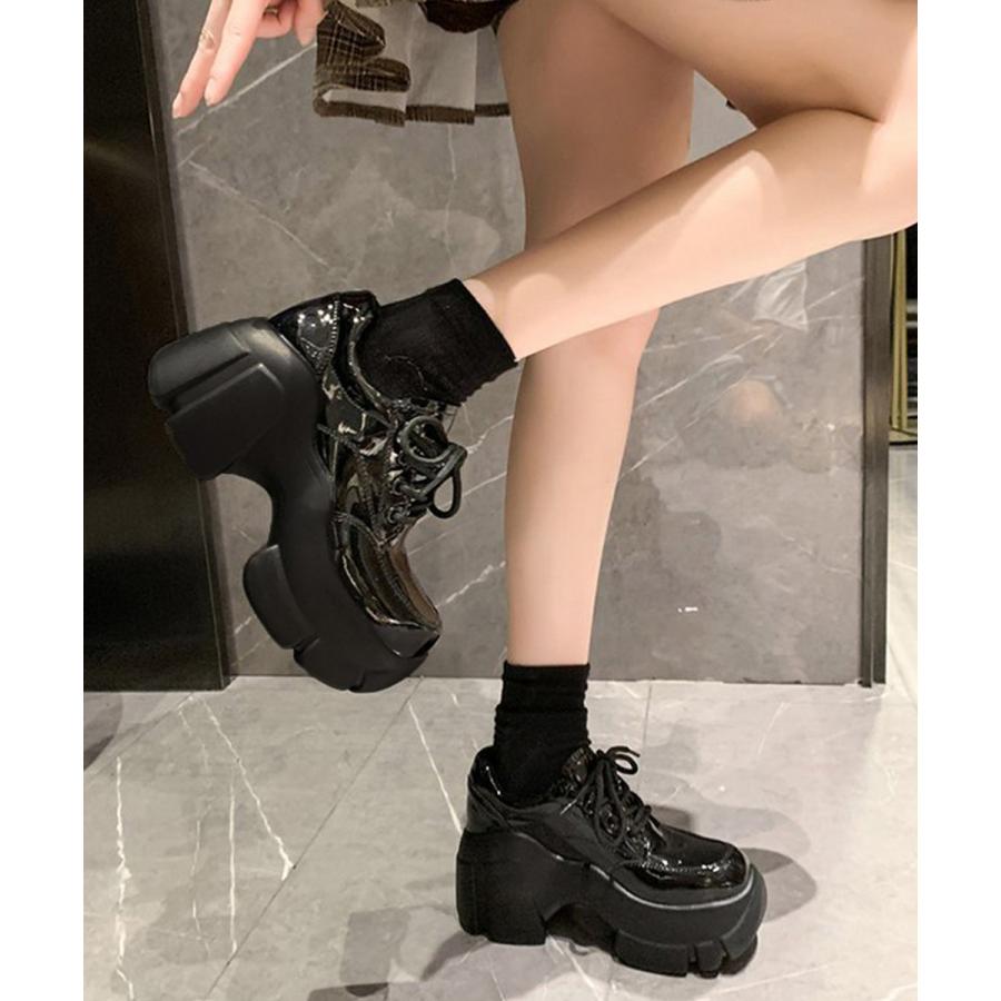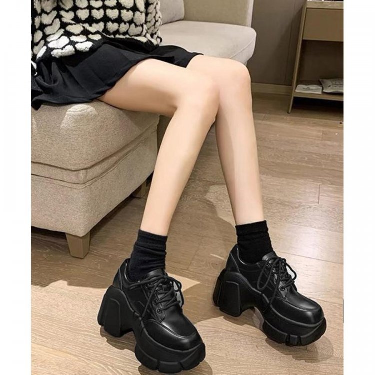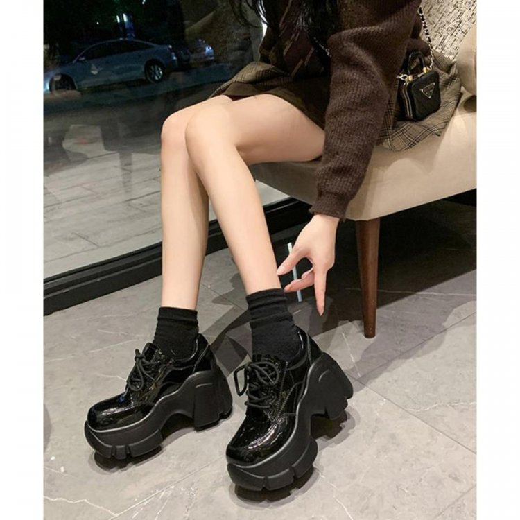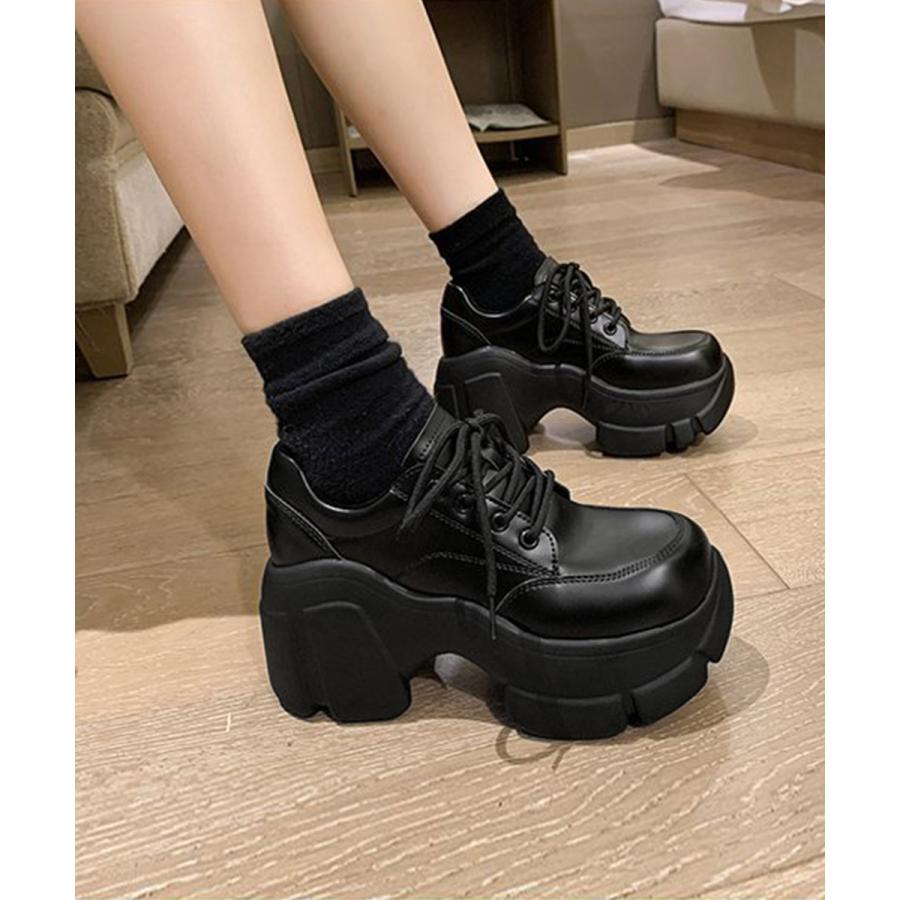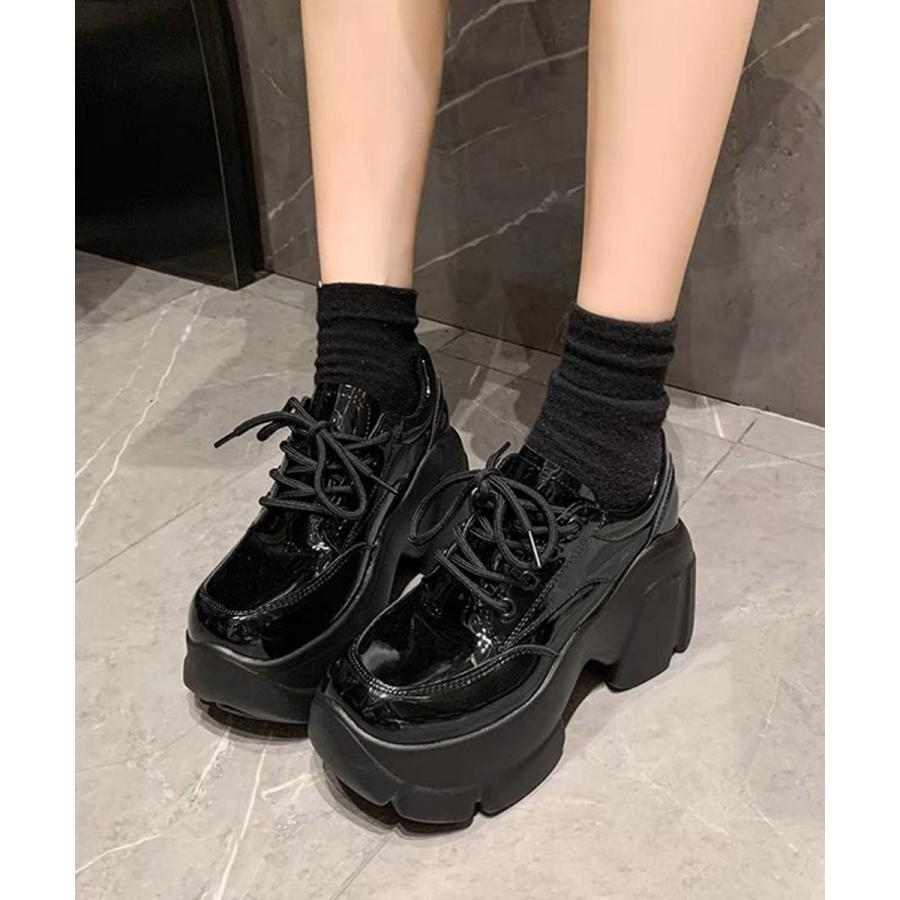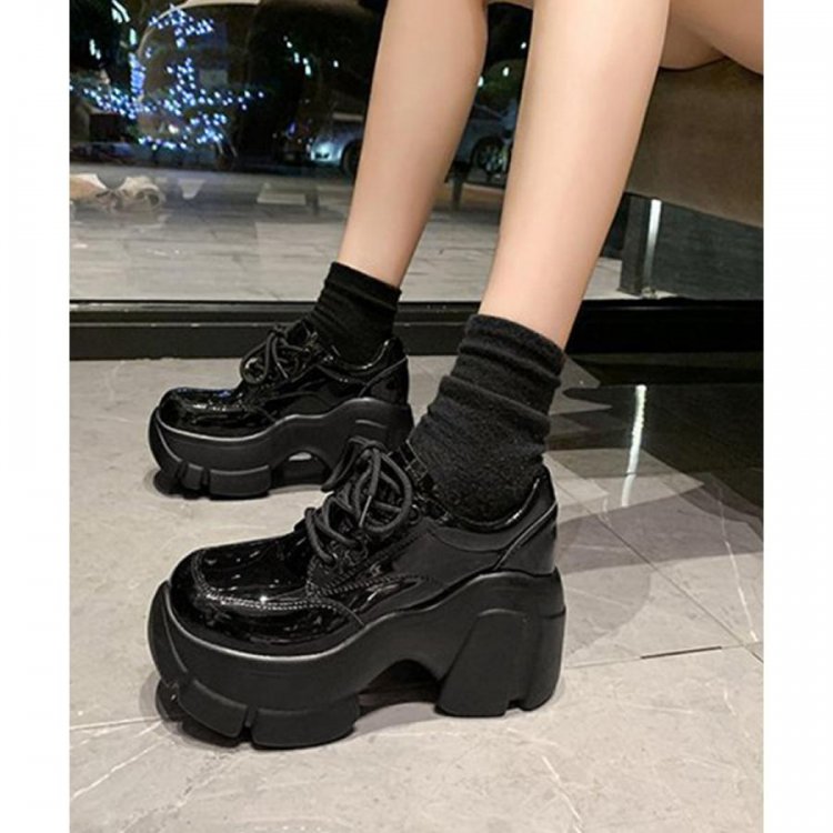 レディース ドレスシューズ 美脚脚長 ボリュームソール 歩きやすい 合皮厚底靴 編み上げ レザー調カジュアル 厚底5cm
