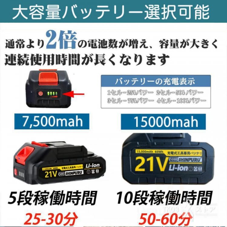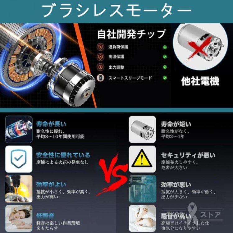 弊社のブラシレスモーター採用、作動時に火花が発生せず、モーターが摩耗しません、寿命、効率が大幅に高まります。内蔵モーターは、超強動力を提供するとともに、過電流保護、過熱保護、充電保護などのインテリジェントな保護機能を提供して、高効率と安全的な作業のを提供できます。従来のモーターと比較して、ブラシレスモーターはより高い効率で動力を供給し、各使用時により効率的に作業できます。同時に寿命も延長されます。