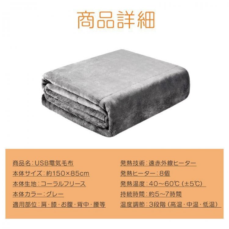 【USBブランケット】電気毛布サイズ:150*85cm約 電源:5V/2A(USBポートより)充電器、モバイルバッテリー、車などから電源を入力できます。