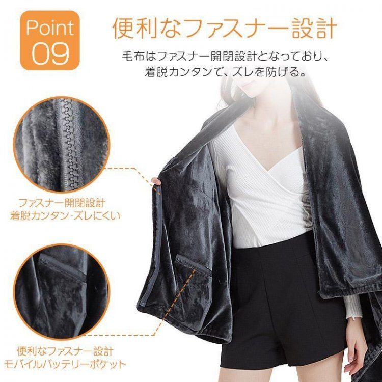 ファスナー付き、肩掛けやひざ掛けや巻きスカートなどとして使えて、冷え解消して体をぽかぽか温めてくれます。
