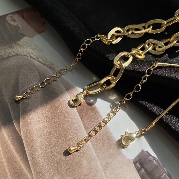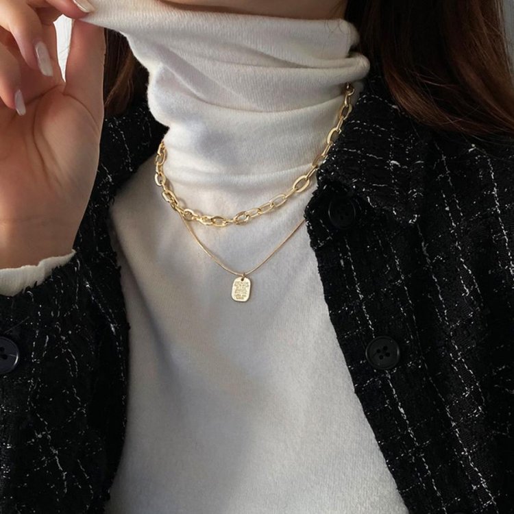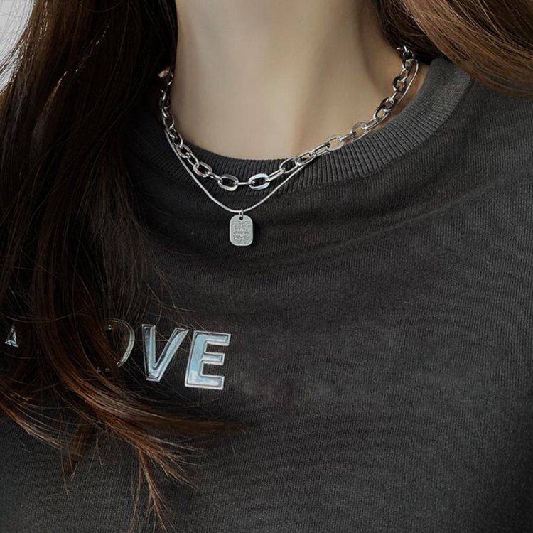 2種類のチェーンがメンズライクのカッコ良さとレディライクのフェミニンさを同時に演出、服の上でもしっかり存在感を発揮する二連ネックレス
