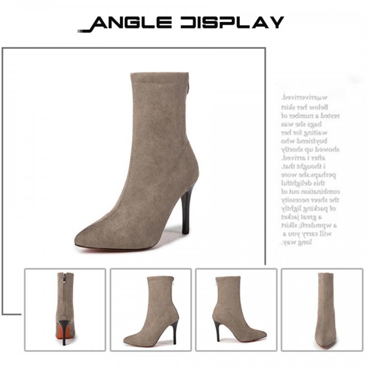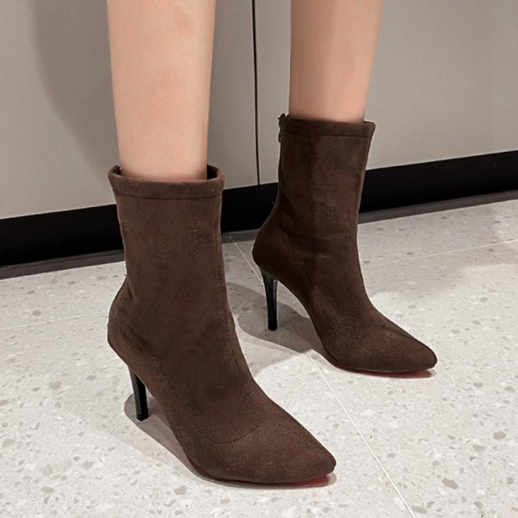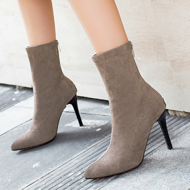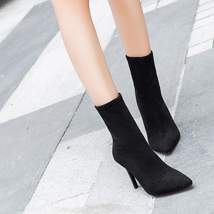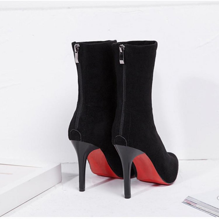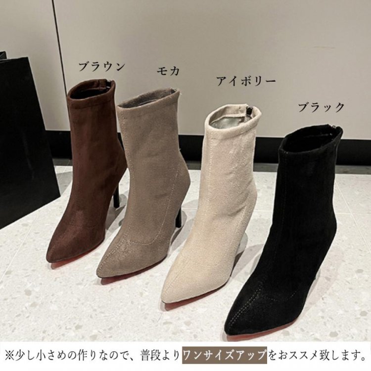 秋冬シューズ ミドル ピンヒールショートブーツ バックジップ ストレッチブーツ ハイヒール ポインテッドトゥ黒靴 韓国風