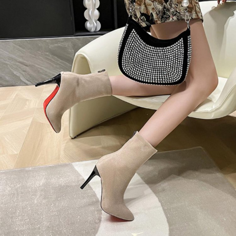 レッドソールが印象的なスエード調ショートブーツ