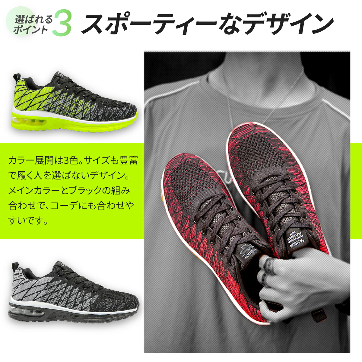 3色カラー展開にサイズも豊富で、履く人を選ばないデザイン。