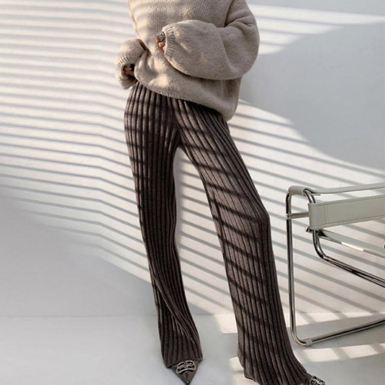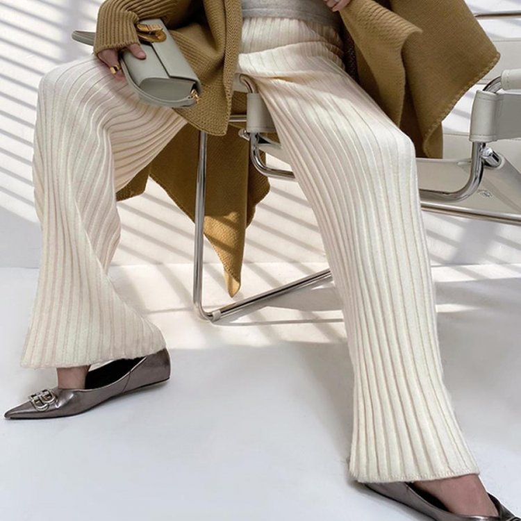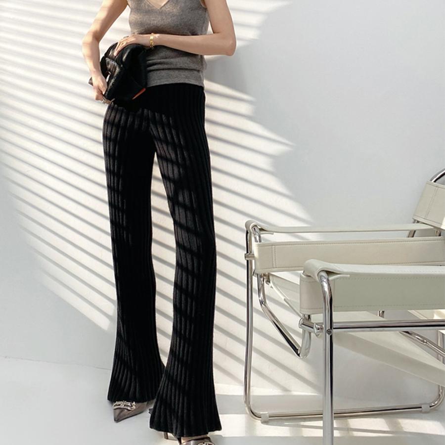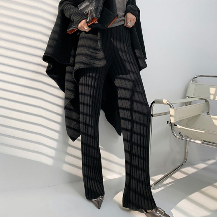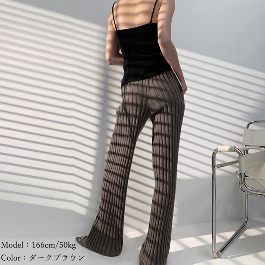 裾に向かって広がるフレアなシルエットがポイントのやや太めのリブニットパンツ