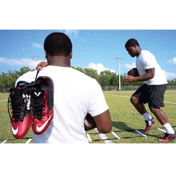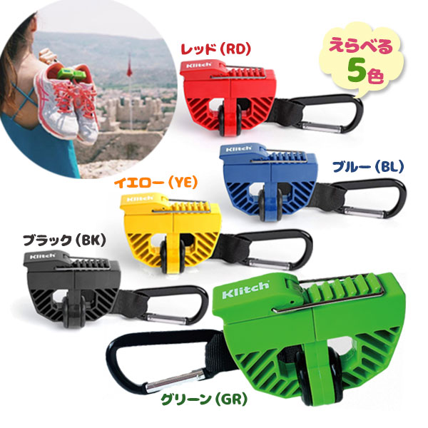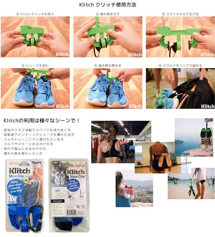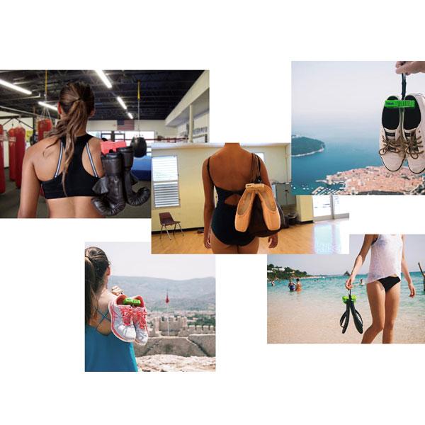 クリップでシューズをまとめ、カラナビでバッグなどに簡単に留めることができます。