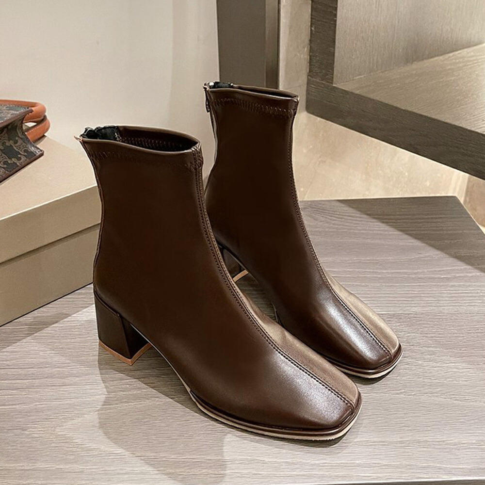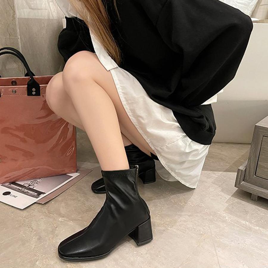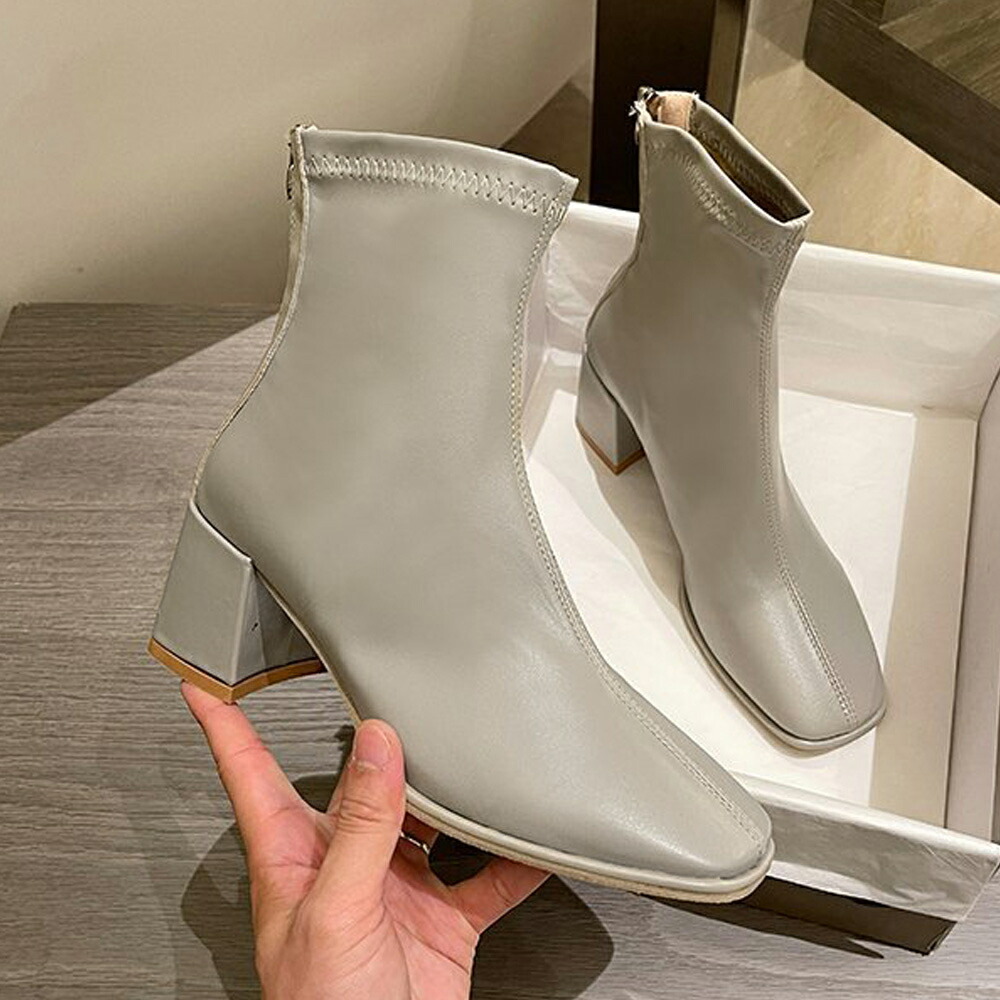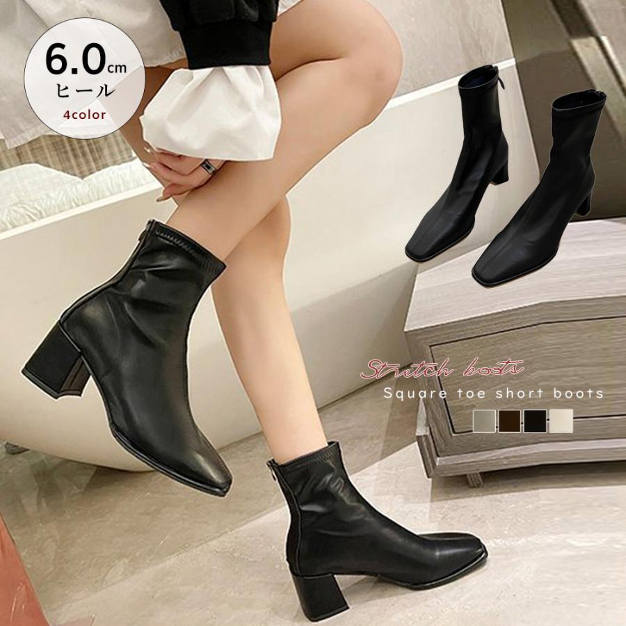 歩きやすい スクエアトゥ ストレッチブーツ チャンキーヒール 韓国 アンクルシューズ 美脚 疲れにくい 靴 柔らかい
