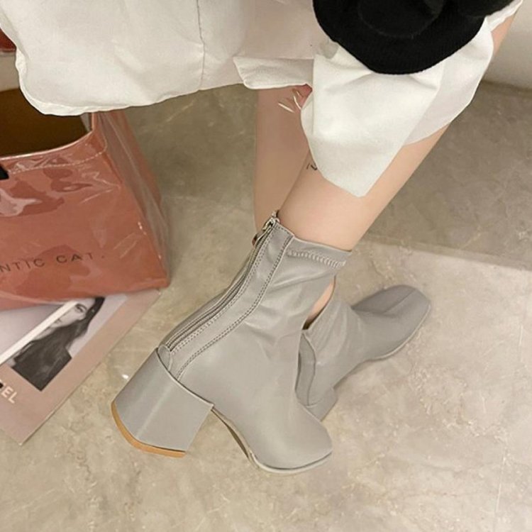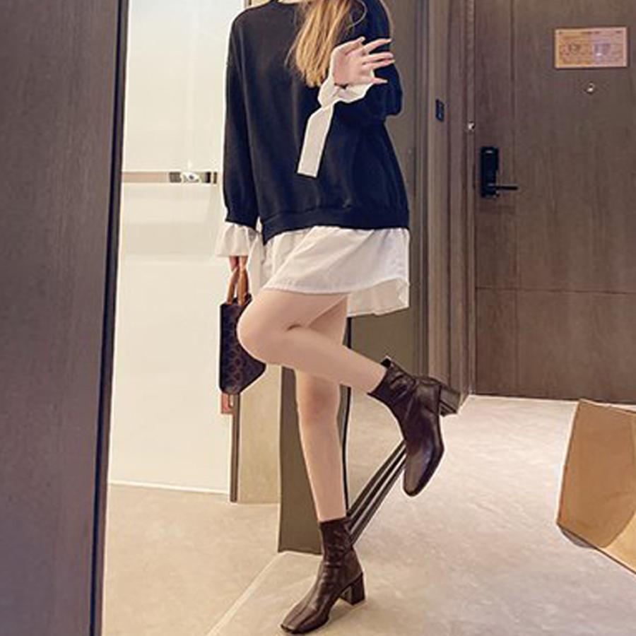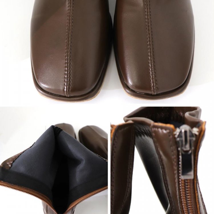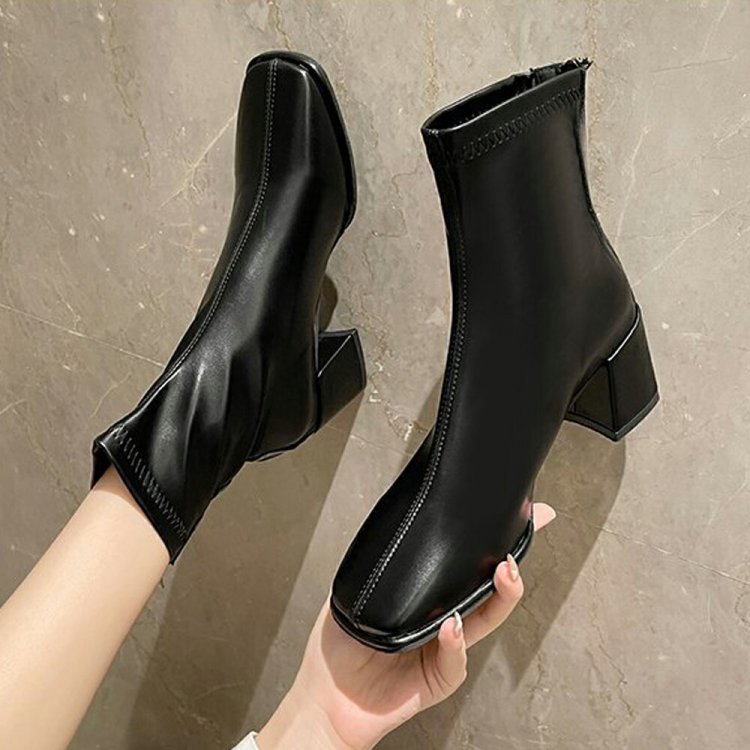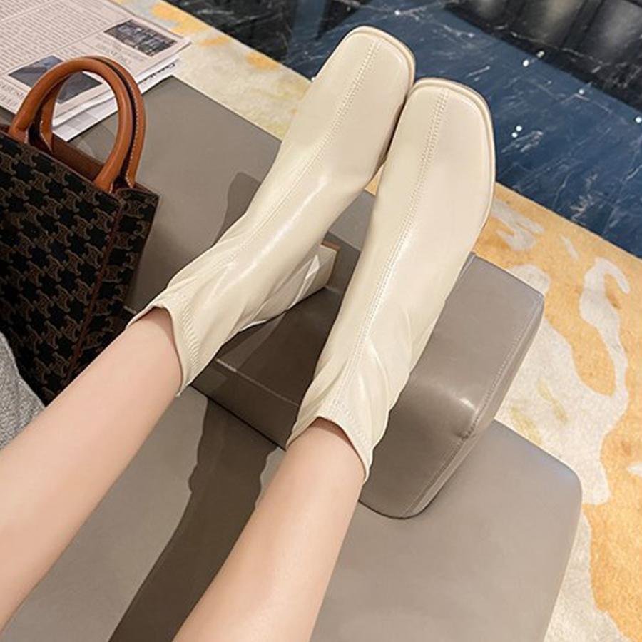 歩きやすい スクエアトゥ ストレッチブーツ チャンキーヒール 韓国 アンクルシューズ 美脚 疲れにくい 靴 柔らかい