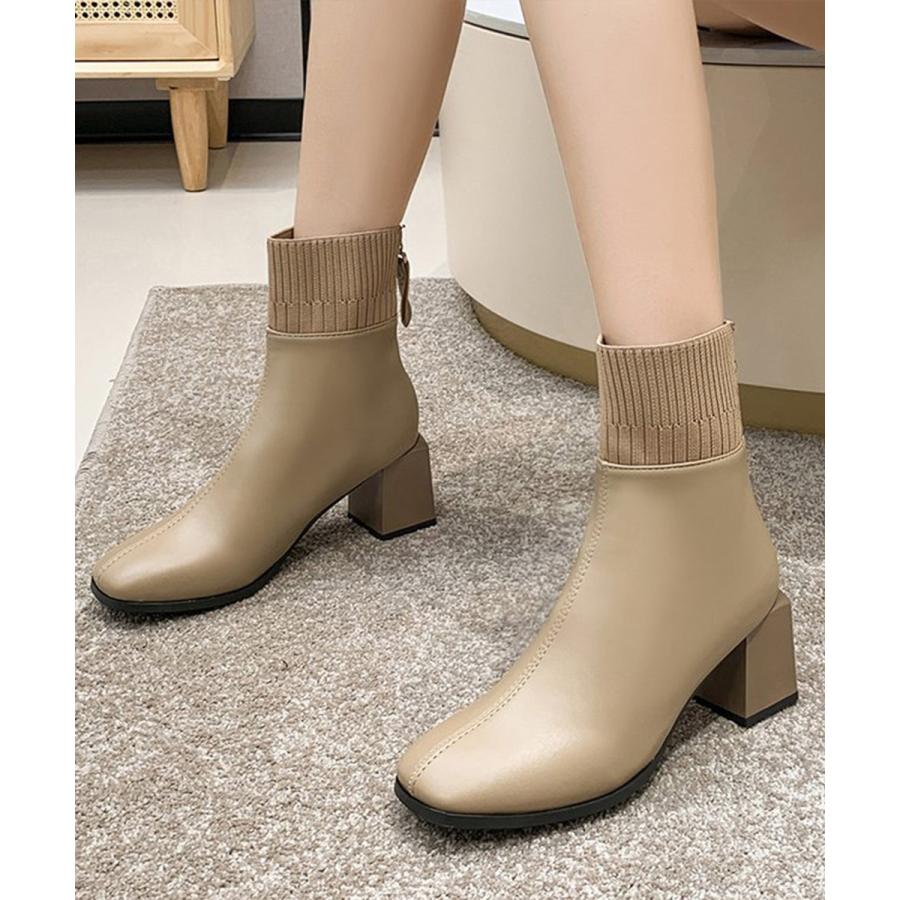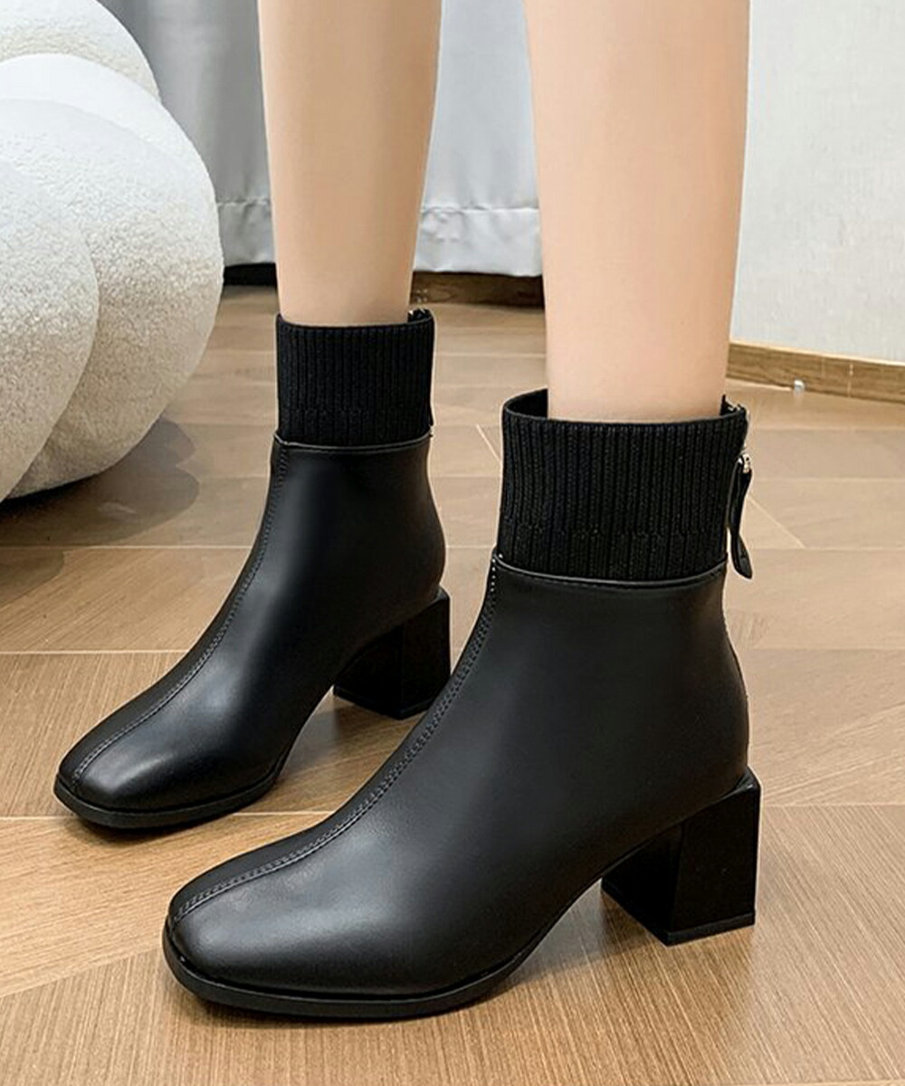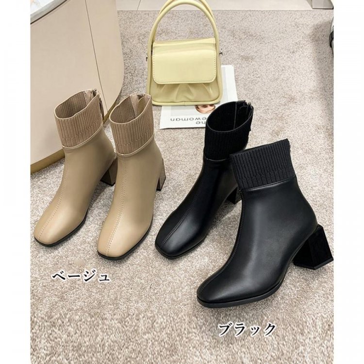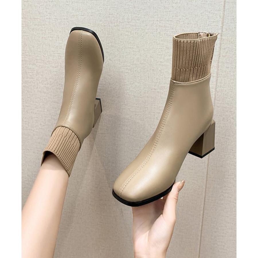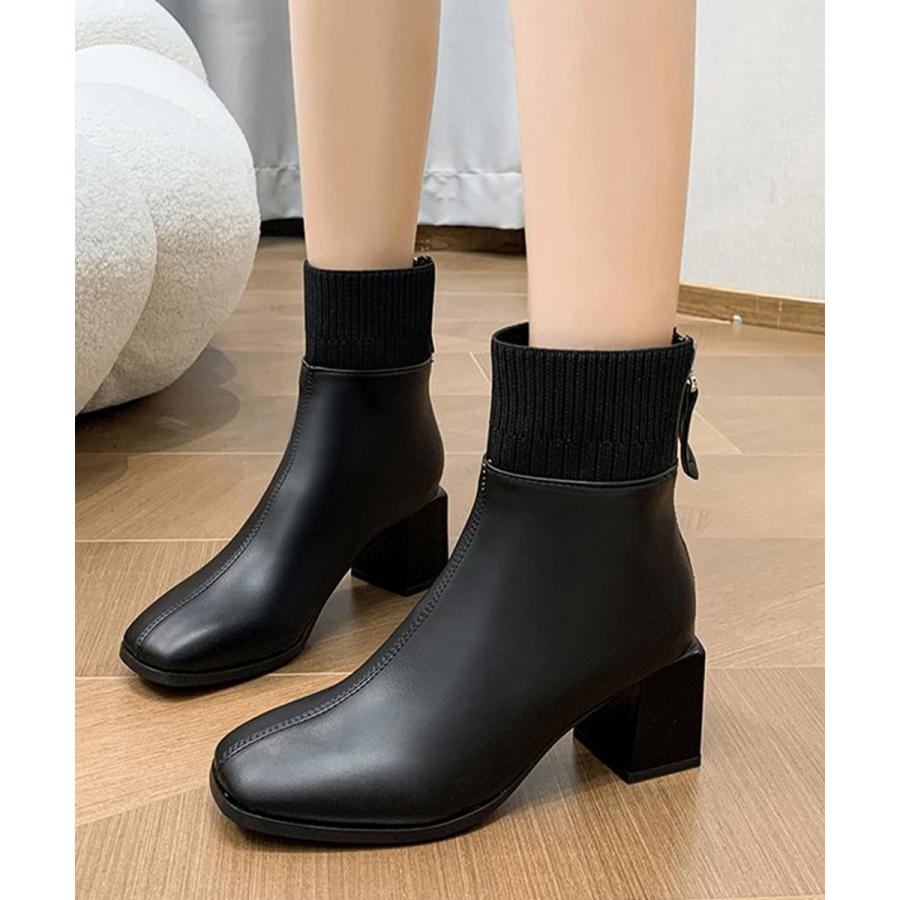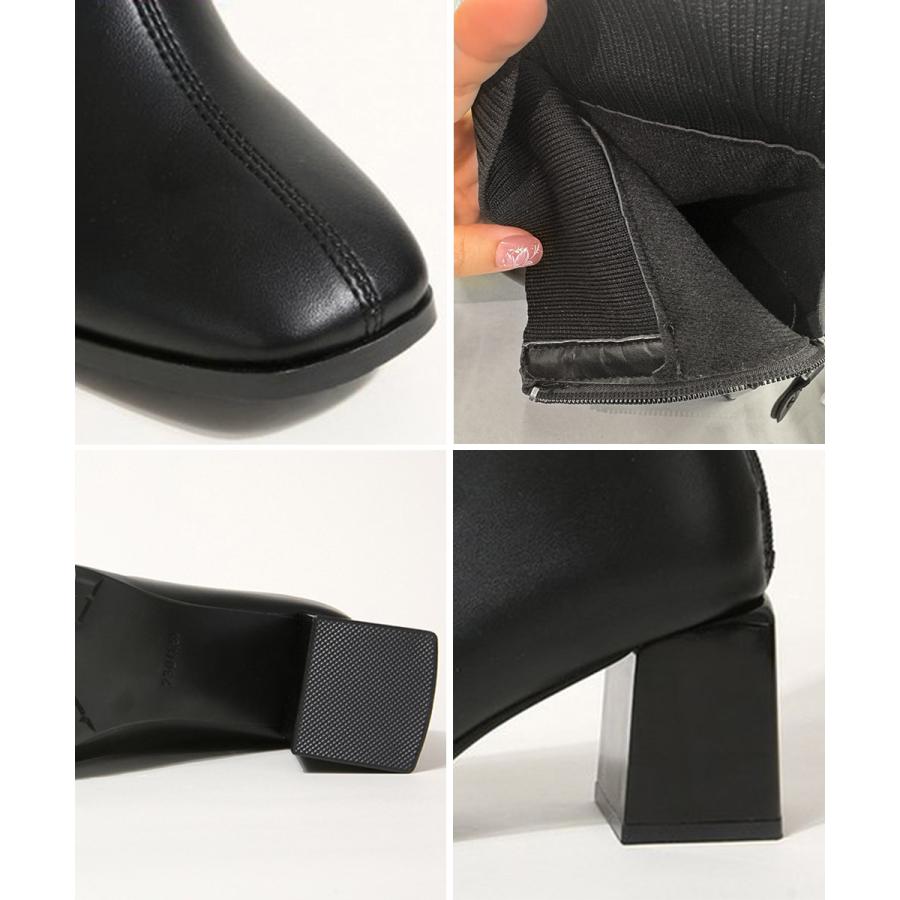 レディース 裏起毛ソックスブーツ PUレザー スクエアトゥブーツ 太ヒールブーティ 痛くない 疲れないブーツ きれいめ靴
