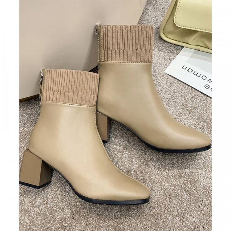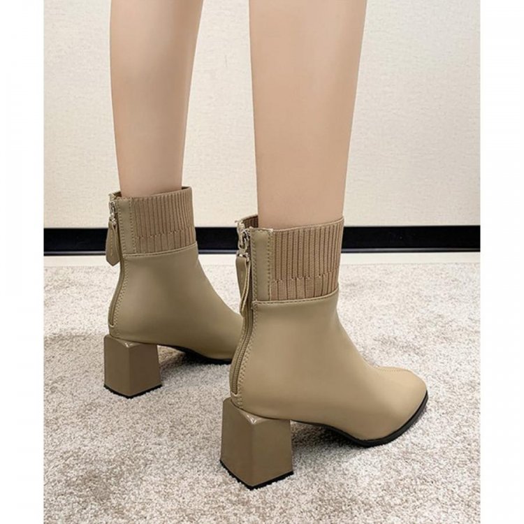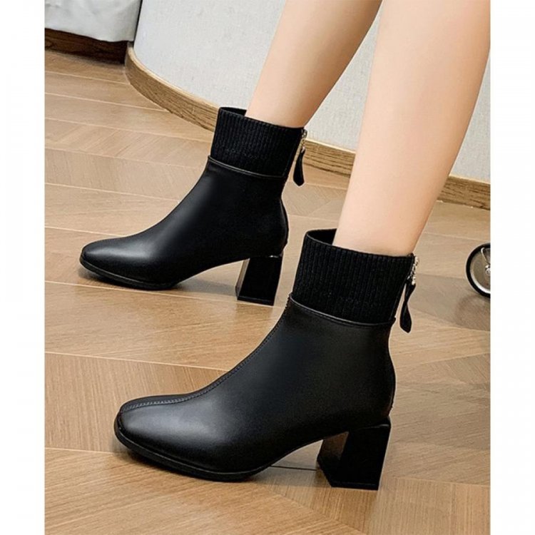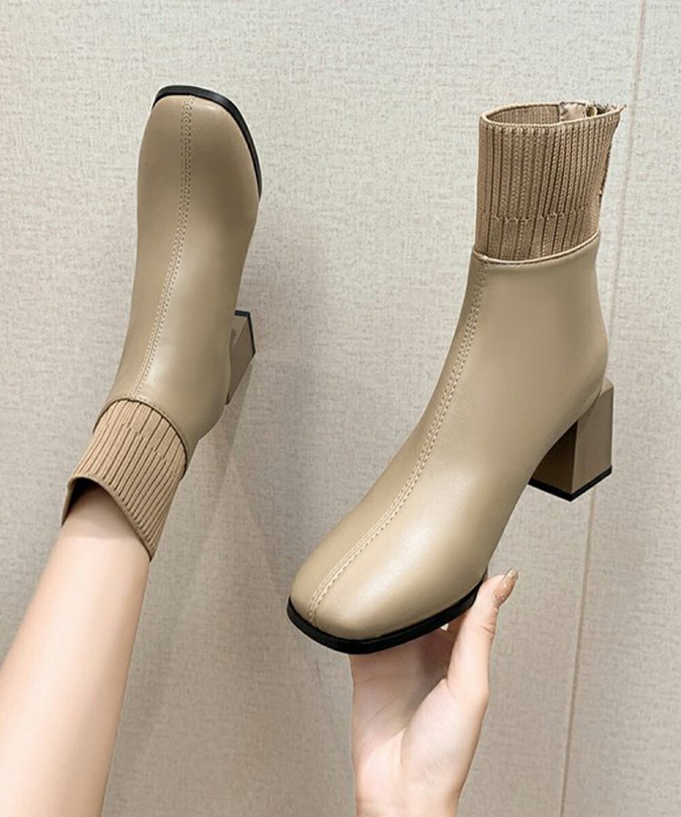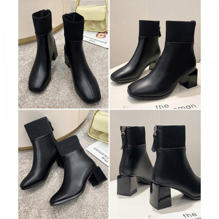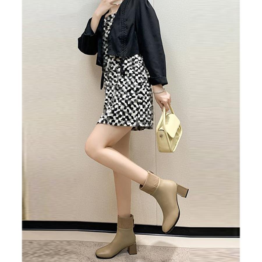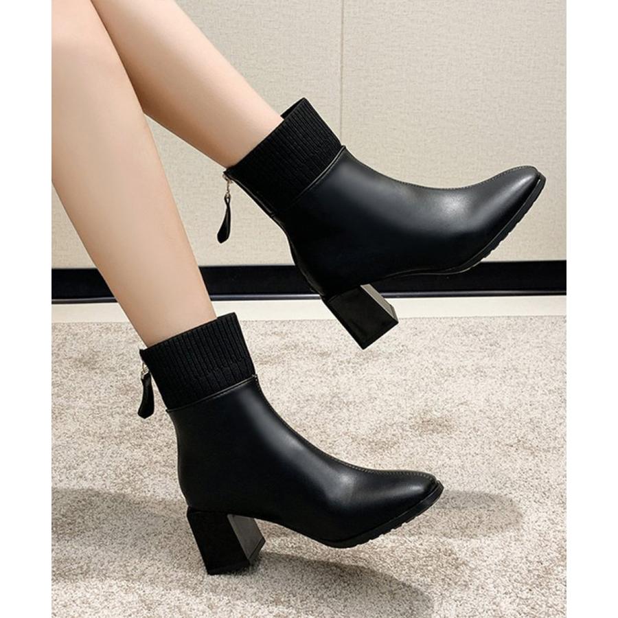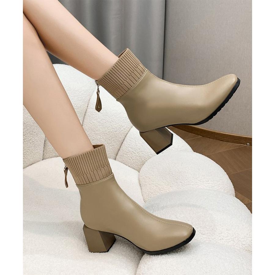 レディース 裏起毛ソックスブーツ PUレザー スクエアトゥブーツ 太ヒールブーティ 痛くない 疲れないブーツ きれいめ靴