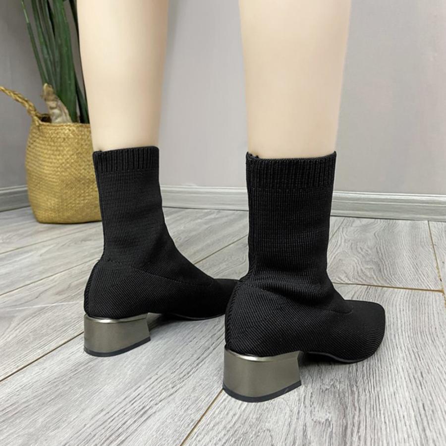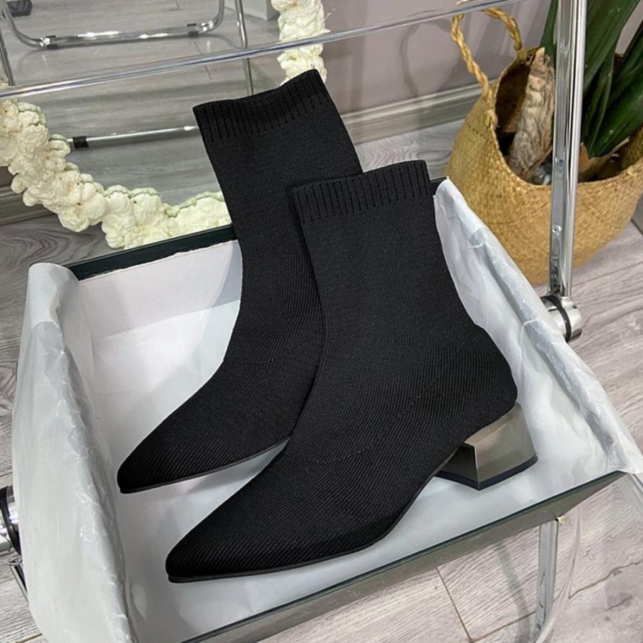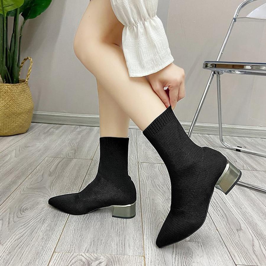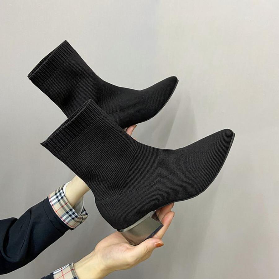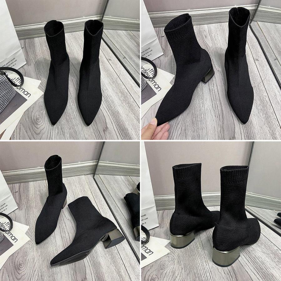 韓国 ポインテッドトゥ ソックスブーツ 歩きやすいニットブーツ きれいめブーティチャンキーヒールシューズ 痛くない秋冬靴