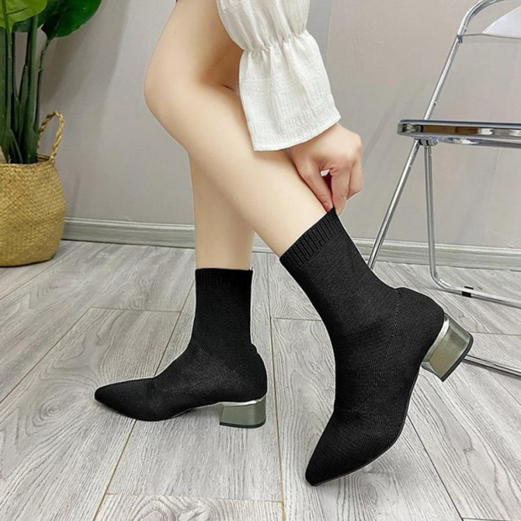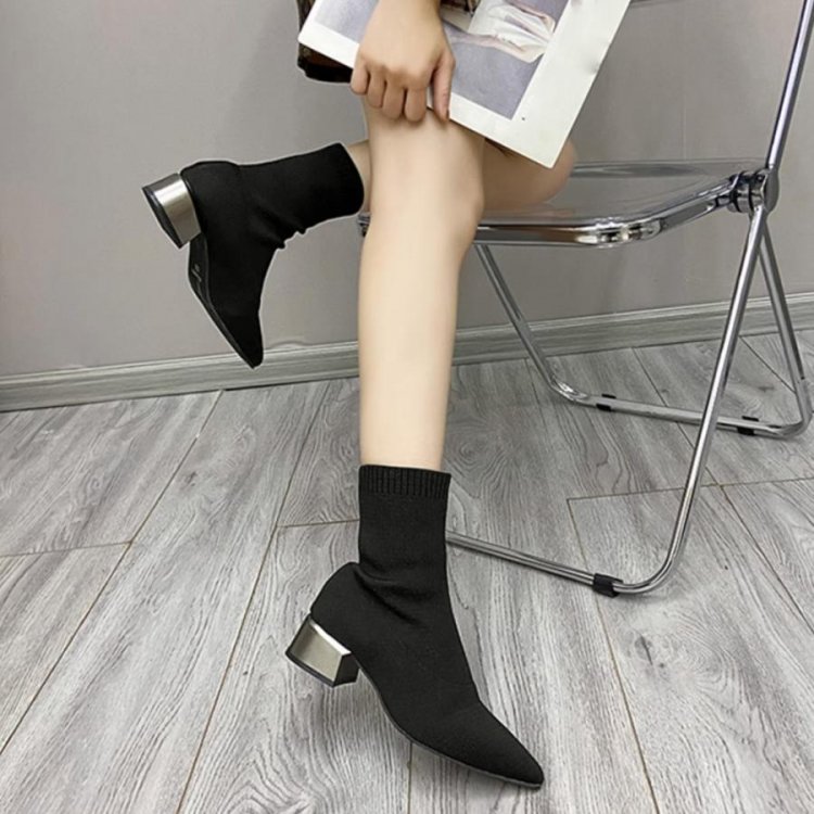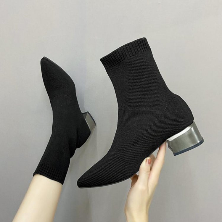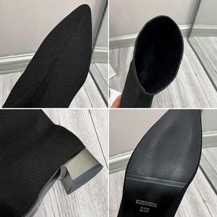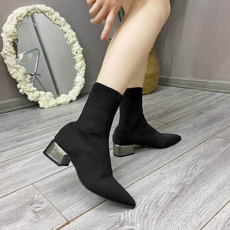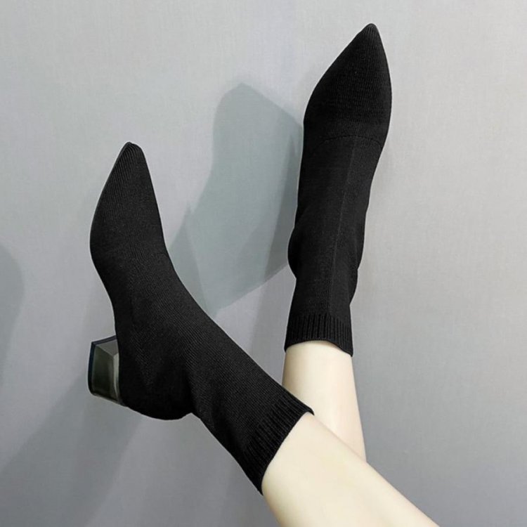 韓国 ポインテッドトゥ ソックスブーツ 歩きやすいニットブーツ きれいめブーティチャンキーヒールシューズ 痛くない秋冬靴