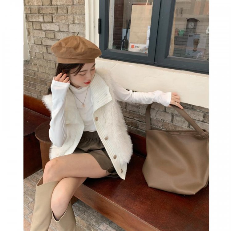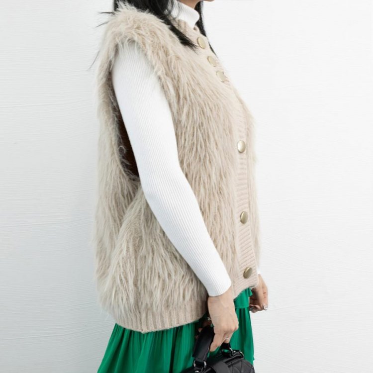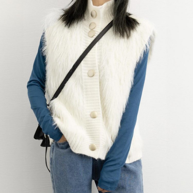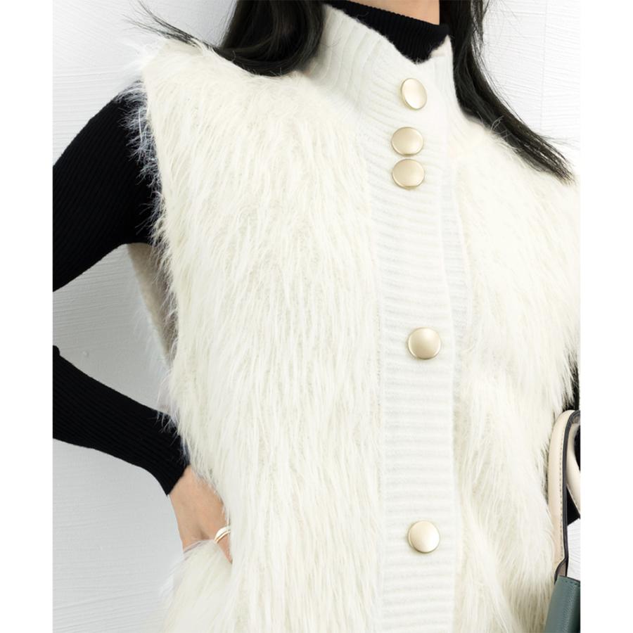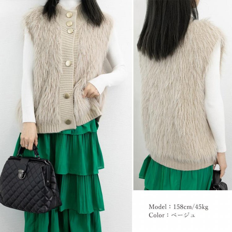 シーズンムード高まるふわふわな肌触り、ずっと触っていたくなるフェイクファー素材とちくちくしない上質ニット素材で仕上げた異素材mixジレ