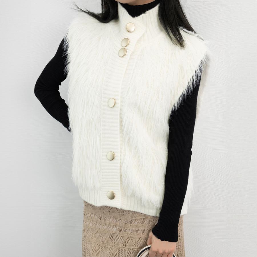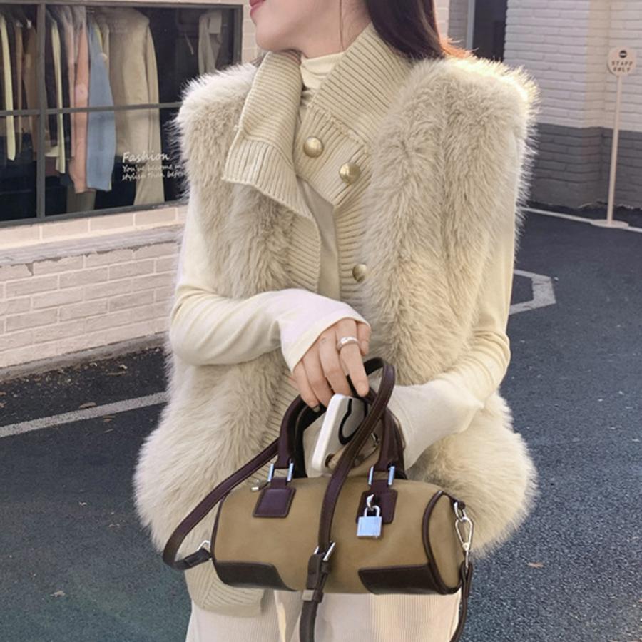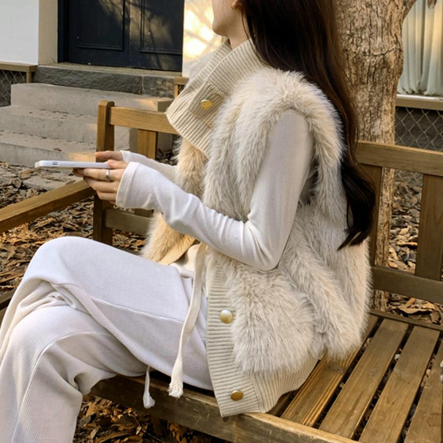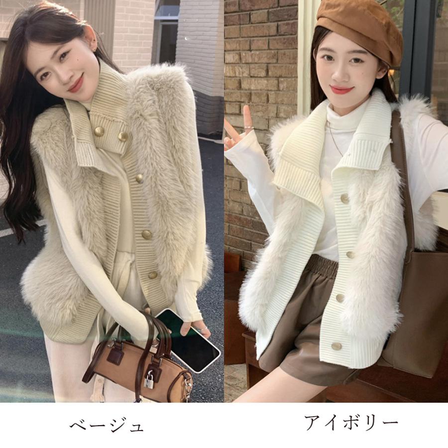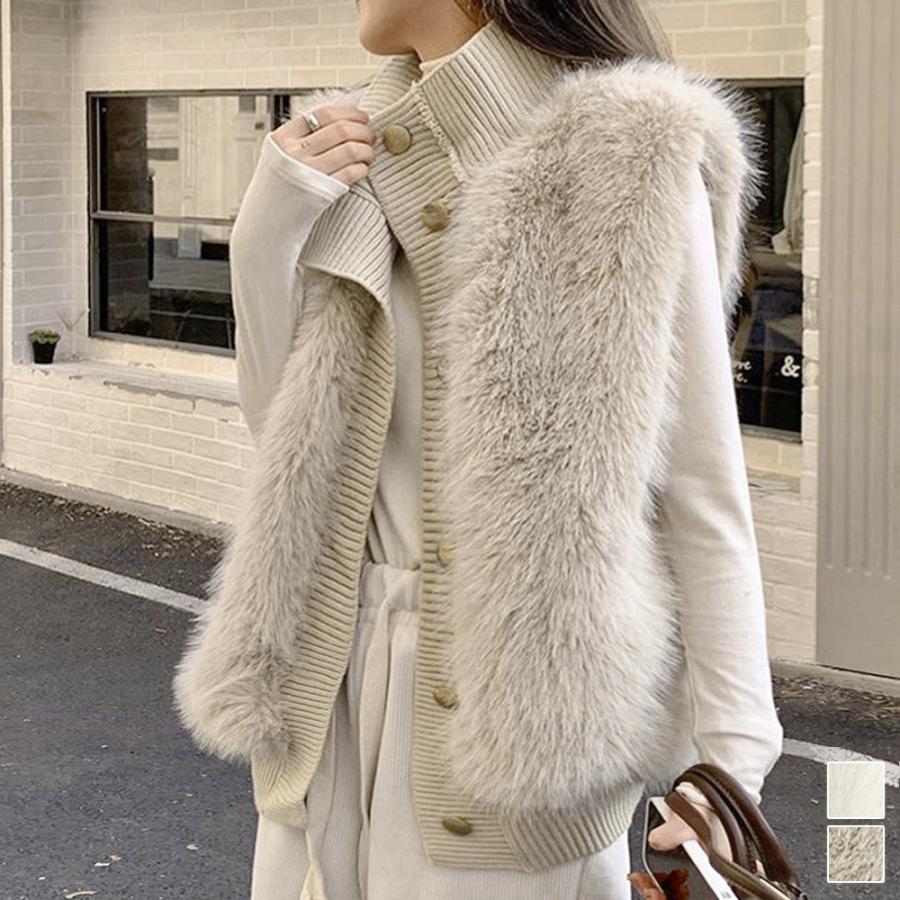 韓国 ファージレ きれいめ スタンドカラーファージャケット 袖なしファーカーディガン 秋冬 ニットアウター 羽織り着やせ