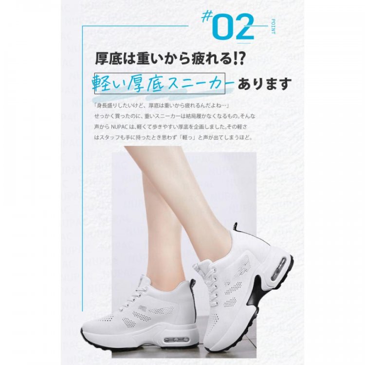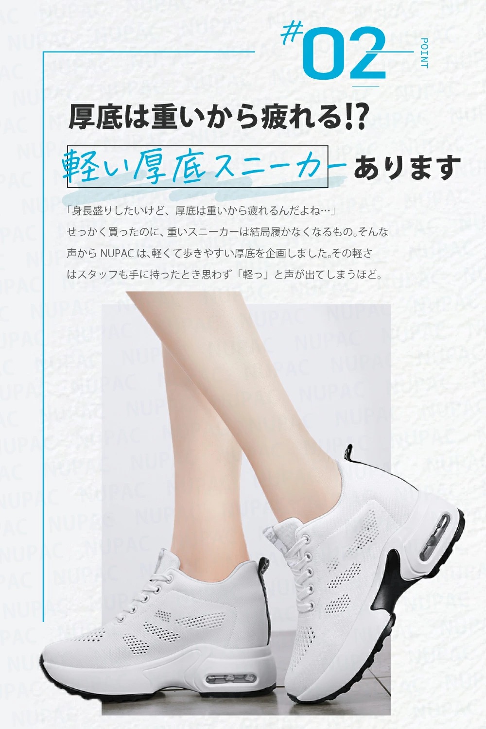 「身長盛りしたいけど、厚底は重いから疲れるんだよね…」せっかく買ったのに、重いスニーカーは結局履かなくなるもの。そんな声からNUPACは、軽くて歩きやすい厚底を企画しました。その軽さはスタッフも手に持ったとき思わず「軽っ」と声が出てしまうほど。