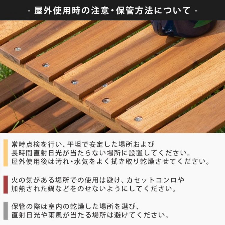 屋外使用時の注意?保管方法についてのご注意ご使用前に毎回点検を行い、平坦で安定した場所および長時間直射日光が当たらない場所を選んで設置して下さい。屋外で使用後は汚れや水気をよく拭き取り、乾燥させて下さい。火気がある場所での使用は避け、カセットコンロや加熱された鍋などをのせないで下さい。保管の際は室内の乾燥した場所を選び、直射日光や雨風が当たる場所は避けて下さい。